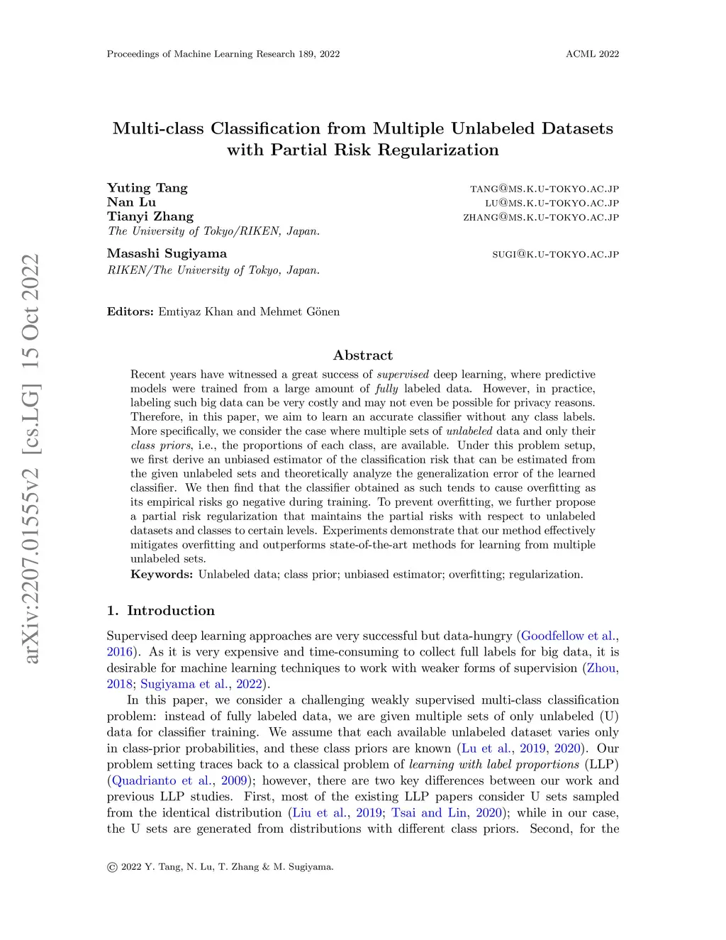Recent years have witnessed a great success of supervised deep learning, where predictive models were trained from a large amount of fully labeled data. However, in practice, labeling such big data can be very costly and may not even be possible for privacy reasons. Therefore, in this paper, we aim to learn an accurate classifier without any class labels. More specifically, we consider the case where multiple sets of unlabeled data and only their class priors, i.e., the proportions of each class, are available. Under this problem setup, we first derive an unbiased estimator of the classification risk that can be estimated from the given unlabeled sets and theoretically analyze the generalization error of the learned classifier. We then find that the classifier obtained as such tends to cause overfitting as its empirical risks go negative during training. To prevent overfitting, we further propose a partial risk regularization that maintains the partial risks with respect to unlabeled datasets and classes to certain levels. Experiments demonstrate that our method effectively mitigates overfitting and outperforms state-of-the-art methods for learning from multiple unlabeled sets.