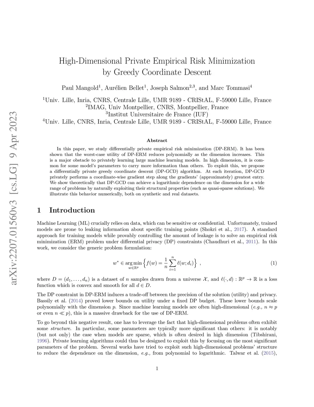 In this paper, we study differentially private empirical risk minimization (DP-ERM). It has been shown that the worst-case utility of DP-ERM reduces polynomially as the dimension increases. This is a major obstacle to privately learning large machine learning models. In high dimension, it is common for some model's parameters to carry more information than others. To exploit this, we propose a differentially private greedy coordinate descent (DP-GCD) algorithm. At each iteration, DP-GCD privately performs a coordinate-wise gradient step along the gradients' (approximately) greatest entry. We show theoretically that DP-GCD can achieve a logarithmic dependence on the dimension for a wide range of problems by naturally exploiting their structural properties (such as quasi-sparse solutions). We illustrate this behavior numerically, both on synthetic and real datasets.