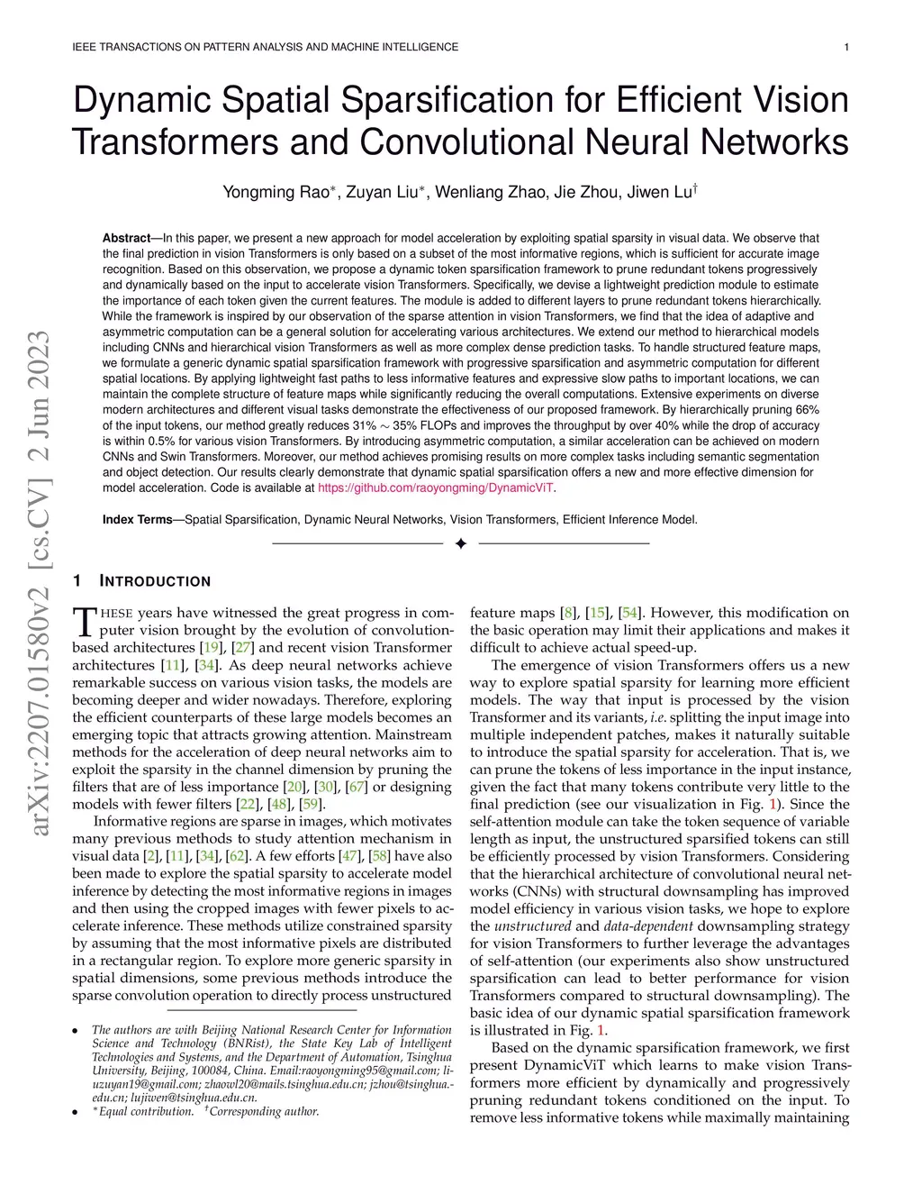 In this paper, we present a new approach for model acceleration by exploiting spatial sparsity in visual data. We observe that the final prediction in vision Transformers is only based on a subset of the most informative tokens, which is sufficient for accurate image recognition. Based on this observation, we propose a dynamic token sparsification framework to prune redundant tokens progressively and dynamically based on the input to accelerate vision Transformers. Specifically, we devise a lightweight prediction module to estimate the importance score of each token given the current features. The module is added to different layers to prune redundant tokens hierarchically. While the framework is inspired by our observation of the sparse attention in vision Transformers, we find the idea of adaptive and asymmetric computation can be a general solution for accelerating various architectures. We extend our method to hierarchical models including CNNs and hierarchical vision Transformers as well as more complex dense prediction tasks that require structured feature maps by formulating a more generic dynamic spatial sparsification framework with progressive sparsification and asymmetric computation for different spatial locations. By applying lightweight fast paths to less informative features and using more expressive slow paths to more important locations, we can maintain the structure of feature maps while significantly reducing the overall computations. Extensive experiments demonstrate the effectiveness of our framework on various modern architectures and different visual recognition tasks. Our results clearly demonstrate that dynamic spatial sparsification offers a new and more effective dimension for model acceleration. Code is available at https://github.com/raoyongming/DynamicViT