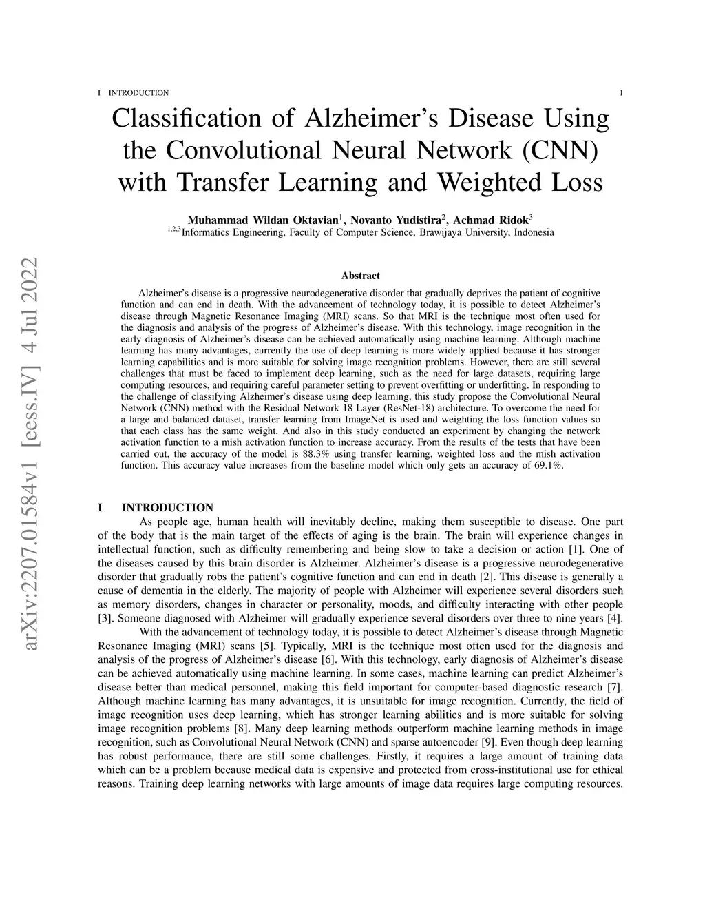 Alzheimer's disease is a progressive neurodegenerative disorder that gradually deprives the patient of cognitive function and can end in death. With the advancement of technology today, it is possible to detect Alzheimer's disease through Magnetic Resonance Imaging (MRI) scans. So that MRI is the technique most often used for the diagnosis and analysis of the progress of Alzheimer's disease. With this technology, image recognition in the early diagnosis of Alzheimer's disease can be achieved automatically using machine learning. Although machine learning has many advantages, currently the use of deep learning is more widely applied because it has stronger learning capabilities and is more suitable for solving image recognition problems. However, there are still several challenges that must be faced to implement deep learning, such as the need for large datasets, requiring large computing resources, and requiring careful parameter setting to prevent overfitting or underfitting. In responding to the challenge of classifying Alzheimer's disease using deep learning, this study propose the Convolutional Neural Network (CNN) method with the Residual Network 18 Layer (ResNet-18) architecture. To overcome the need for a large and balanced dataset, transfer learning from ImageNet is used and weighting the loss function values so that each class has the same weight. And also in this study conducted an experiment by changing the network activation function to a mish activation function to increase accuracy. From the results of the tests that have been carried out, the accuracy of the model is 88.3 % using transfer learning, weighted loss and the mish activation function. This accuracy value increases from the baseline model which only gets an accuracy of 69.1 %.