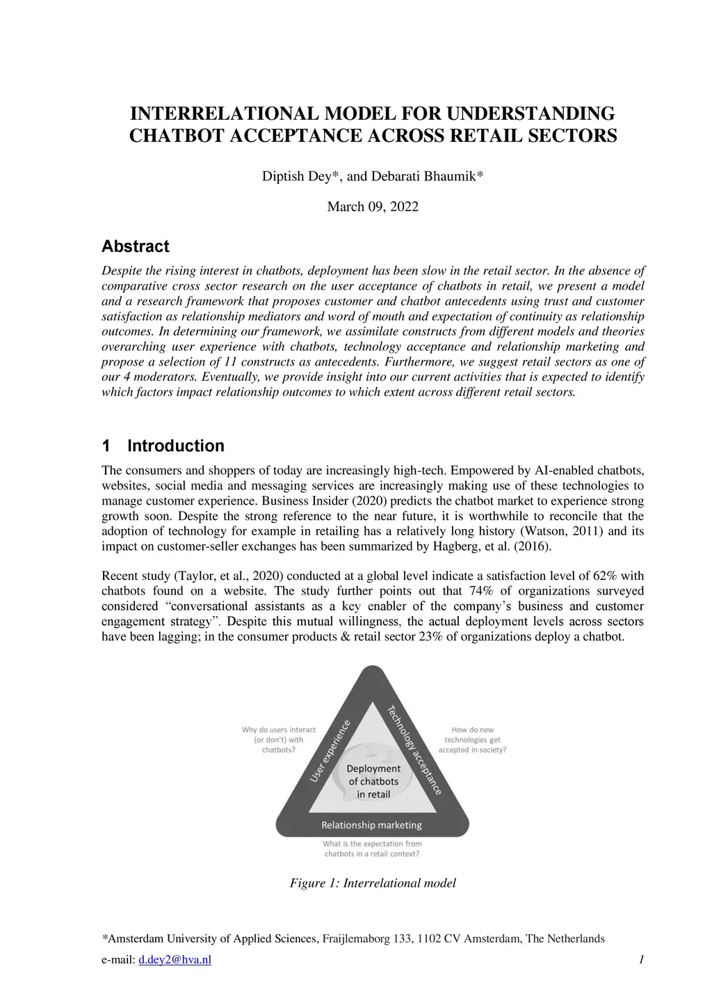 Despite the rising interest in chatbots, deployment has been slow in the retail sector. In the absence of comparative cross sector research on the user acceptance of chatbots in retail, we present a model and a research framework that proposes customer and chatbot antecedents using trust and customer satisfaction as relationship mediators and word of mouth and expectation of continuity as relationship outcomes. In determining our framework, we assimilate constructs from different models and theories overarching user experience with chatbots, technology acceptance and relationship marketing and propose a selection of 11 constructs as antecedents. Furthermore, we suggest retail sectors as one of our 4 moderators. Eventually, we provide insight into our current activities that is expected to identify which factors impact relationship outcomes to which extent across different retail sectors.