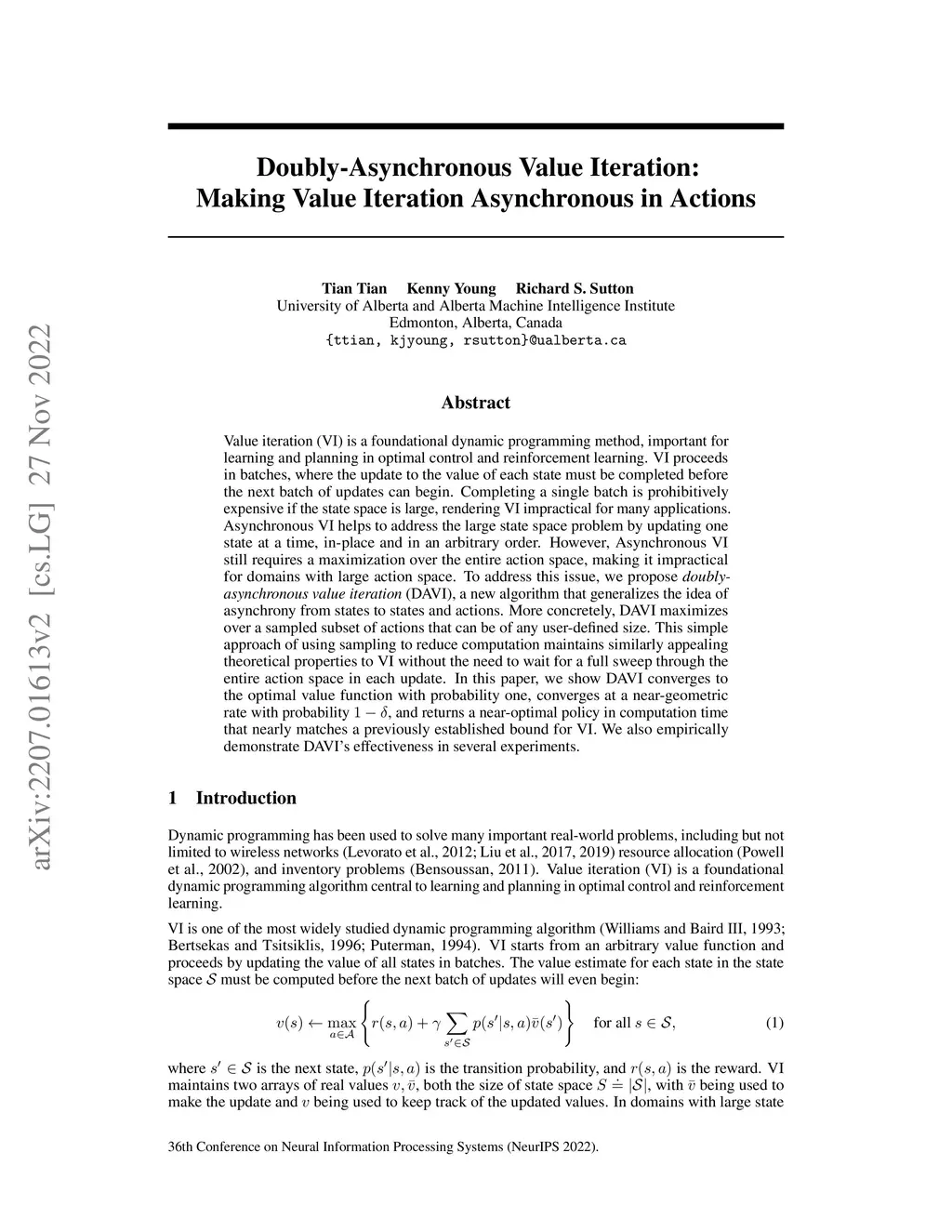 Value iteration (VI) is a foundational dynamic programming method, important for learning and planning in optimal control and reinforcement learning. VI proceeds in batches, where the update to the value of each state must be completed before the next batch of updates can begin. Completing a single batch is prohibitively expensive if the state space is large, rendering VI impractical for many applications. Asynchronous VI helps to address the large state space problem by updating one state at a time, in-place and in an arbitrary order. However, Asynchronous VI still requires a maximization over the entire action space, making it impractical for domains with large action space. To address this issue, we propose doubly-asynchronous value iteration (DAVI), a new algorithm that generalizes the idea of asynchrony from states to states and actions. More concretely, DAVI maximizes over a sampled subset of actions that can be of any user-defined size. This simple approach of using sampling to reduce computation maintains similarly appealing theoretical properties to VI without the need to wait for a full sweep through the entire action space in each update. In this paper, we show DAVI converges to the optimal value function with probability one, converges at a near-geometric rate with probability 1-delta, and returns a near-optimal policy in computation time that nearly matches a previously established bound for VI. We also empirically demonstrate DAVI's effectiveness in several experiments.