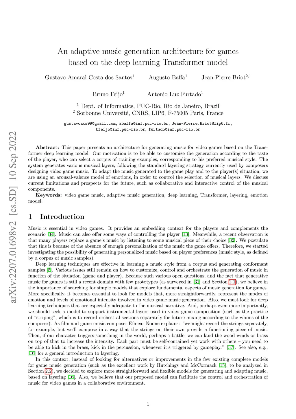 This paper presents an architecture for generating music for video games based on the Transformer deep learning model. Our motivation is to be able to customize the generation according to the taste of the player, who can select a corpus of training examples, corresponding to his preferred musical style. The system generates various musical layers, following the standard layering strategy currently used by composers designing video game music. To adapt the music generated to the game play and to the player(s) situation, we are using an arousal-valence model of emotions, in order to control the selection of musical layers. We discuss current limitations and prospects for the future, such as collaborative and interactive control of the musical components.