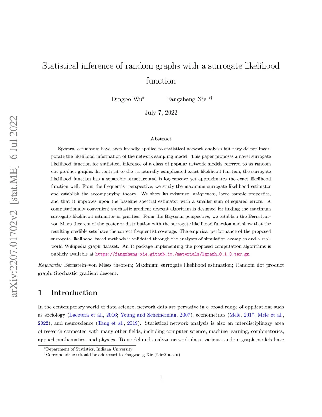 Spectral estimators have been broadly applied to statistical network analysis but they do not incorporate the likelihood information of the network sampling model. This paper proposes a novel surrogate likelihood function for statistical inference of a class of popular network models referred to as random dot product graphs. In contrast to the structurally complicated exact likelihood function, the surrogate likelihood function has a separable structure and is log-concave yet approximates the exact likelihood function well. From the frequentist perspective, we study the maximum surrogate likelihood estimator and establish the accompanying theory. We show its existence, uniqueness, large sample properties, and that it improves upon the baseline spectral estimator with a smaller sum of squared errors. A computationally convenient stochastic gradient descent algorithm is designed for finding the maximum surrogate likelihood estimator in practice. From the Bayesian perspective, we establish the Bernstein--von Mises theorem of the posterior distribution with the surrogate likelihood function and show that the resulting credible sets have the correct frequentist coverage. The empirical performance of the proposed surrogate-likelihood-based methods is validated through the analyses of simulation examples and a real-world Wikipedia graph dataset. An R package implementing the proposed computation algorithms is publicly available at https://fangzheng-xie.github.io./publication/ .