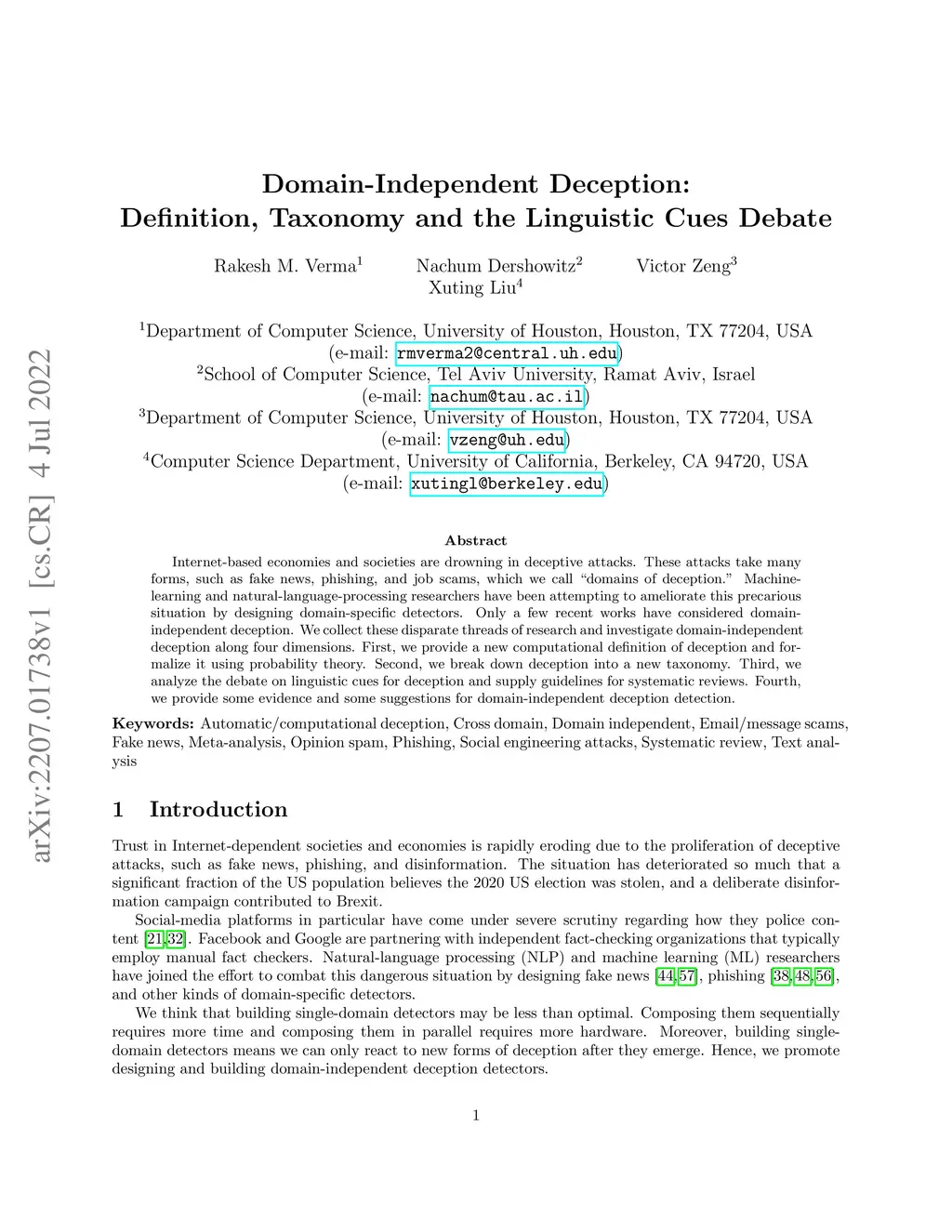 Internet-based economies and societies are drowning in deceptive attacks. These attacks take many forms, such as fake news, phishing, and job scams, which we call "domains of deception." Machine-learning and natural-language-processing researchers have been attempting to ameliorate this precarious situation by designing domain-specific detectors. Only a few recent works have considered domain-independent deception. We collect these disparate threads of research and investigate domain-independent deception along four dimensions. First, we provide a new computational definition of deception and formalize it using probability theory. Second, we break down deception into a new taxonomy. Third, we analyze the debate on linguistic cues for deception and supply guidelines for systematic reviews. Fourth, we provide some evidence and some suggestions for domain-independent deception detection.