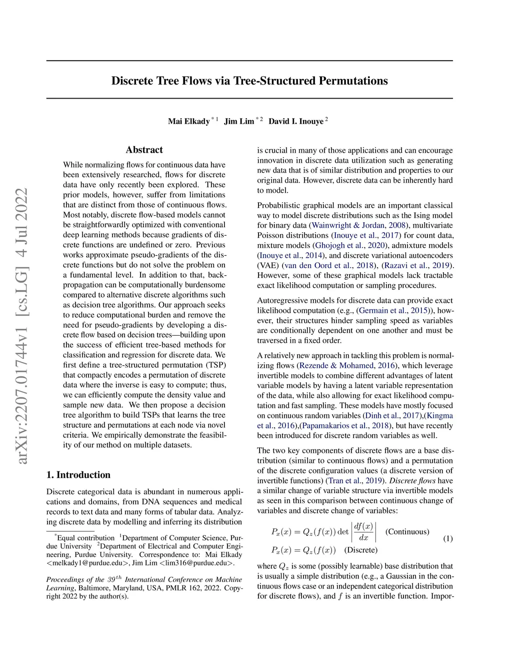 While normalizing flows for continuous data have been extensively researched, flows for discrete data have only recently been explored. These prior models, however, suffer from limitations that are distinct from those of continuous flows. Most notably, discrete flow-based models cannot be straightforwardly optimized with conventional deep learning methods because gradients of discrete functions are undefined or zero. Previous works approximate pseudo-gradients of the discrete functions but do not solve the problem on a fundamental level. In addition to that, backpropagation can be computationally burdensome compared to alternative discrete algorithms such as decision tree algorithms. Our approach seeks to reduce computational burden and remove the need for pseudo-gradients by developing a discrete flow based on decision trees -- building upon the success of efficient tree-based methods for classification and regression for discrete data. We first define a tree-structured permutation (TSP) that compactly encodes a permutation of discrete data where the inverse is easy to compute; thus, we can efficiently compute the density value and sample new data. We then propose a decision tree algorithm to build TSPs that learns the tree structure and permutations at each node via novel criteria. We empirically demonstrate the feasibility of our method on multiple datasets.