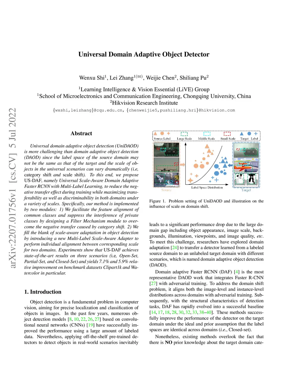 Universal domain adaptive object detection (UniDAOD)is more challenging than domain adaptive object detection (DAOD) since the label space of the source domain may not be the same as that of the target and the scale of objects in the universal scenarios can vary dramatically (i.e, category shift and scale shift). To this end, we propose US-DAF, namely Universal Scale-Aware Domain Adaptive Faster RCNN with Multi-Label Learning, to reduce the negative transfer effect during training while maximizing transferability as well as discriminability in both domains under a variety of scales. Specifically, our method is implemented by two modules: 1) We facilitate the feature alignment of common classes and suppress the interference of private classes by designing a Filter Mechanism module to overcome the negative transfer caused by category shift. 2) We fill the blank of scale-aware adaptation in object detection by introducing a new Multi-Label Scale-Aware Adapter to perform individual alignment between the corresponding scale for two domains. Experiments show that US-DAF achieves state-of-the-art results on three scenarios (i.e, Open-Set, Partial-Set, and Closed-Set) and yields 7.1% and 5.9% relative improvement on benchmark datasets Clipart1k and Watercolor in particular.