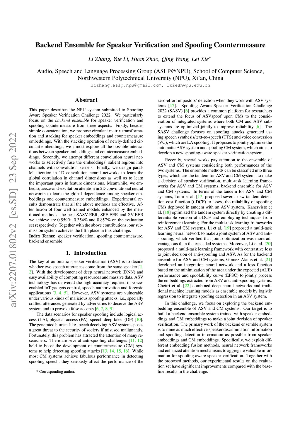 This paper describes the NPU system submitted to Spoofing Aware Speaker Verification Challenge 2022. We particularly focus on the \textit{backend ensemble} for speaker verification and spoofing countermeasure from three aspects. Firstly, besides simple concatenation, we propose circulant matrix transformation and stacking for speaker embeddings and countermeasure embeddings. With the stacking operation of newly-defined circulant embeddings, we almost explore all the possible interactions between speaker embeddings and countermeasure embeddings. Secondly, we attempt different convolution neural networks to selectively fuse the embeddings' salient regions into channels with convolution kernels. Finally, we design parallel attention in 1D convolution neural networks to learn the global correlation in channel dimensions as well as to learn the important parts in feature dimensions. Meanwhile, we embed squeeze-and-excitation attention in 2D convolutional neural networks to learn the global dependence among speaker embeddings and countermeasure embeddings. Experimental results demonstrate that all the above methods are effective. After fusion of four well-trained models enhanced by the mentioned methods, the best SASV-EER, SPF-EER and SV-EER we achieve are 0.559\%, 0.354\% and 0.857\% on the evaluation set respectively. Together with the above contributions, our submission system achieves the fifth place in this challenge.