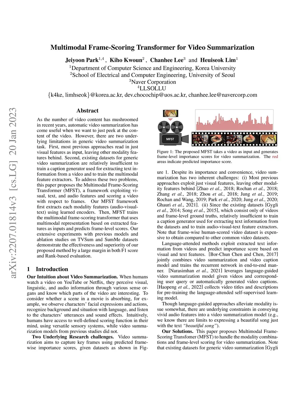 Multimodal Frame-Scoring Transformer for Video Summarization