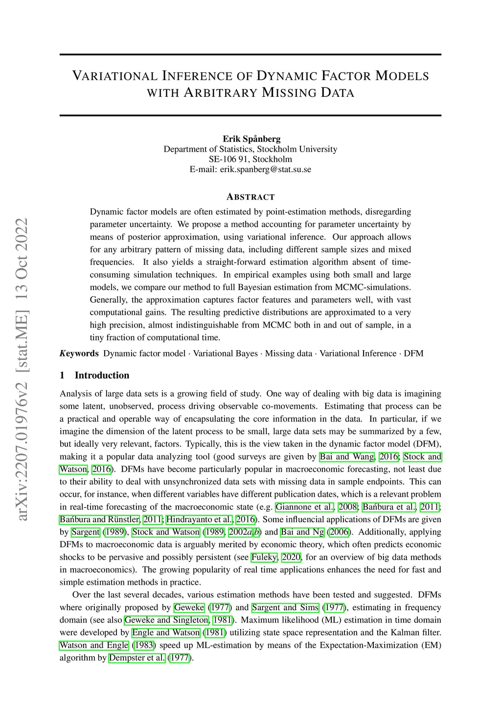 Dynamic factor models are often estimated by point-estimation methods, disregarding parameter uncertainty. We propose a method accounting for parameter uncertainty by means of posterior approximation, using variational inference. Our approach allows for any arbitrary pattern of missing data, including different sample sizes and mixed frequencies. It also yields a straight-forward estimation algorithm absent of time-consuming simulation techniques. In empirical examples using both small and large models, we compare our method to full Bayesian estimation from MCMC-simulations. Generally, the approximation captures factor features and parameters well, with vast computational gains. The resulting predictive distributions are approximated to a very high precision, almost indistinguishable from MCMC both in and out of sample, in a tiny fraction of computational time.