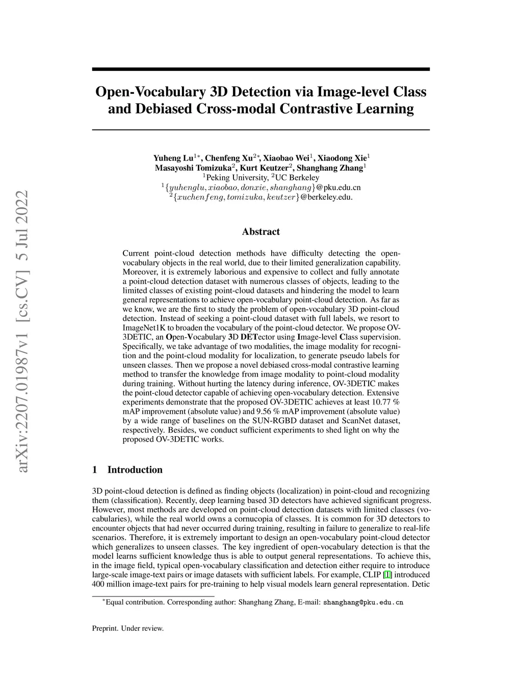Current point-cloud detection methods have difficulty detecting the open-vocabulary objects in the real world, due to their limited generalization capability. Moreover, it is extremely laborious and expensive to collect and fully annotate a point-cloud detection dataset with numerous classes of objects, leading to the limited classes of existing point-cloud datasets and hindering the model to learn general representations to achieve open-vocabulary point-cloud detection. As far as we know, we are the first to study the problem of open-vocabulary 3D point-cloud detection. Instead of seeking a point-cloud dataset with full labels, we resort to ImageNet1K to broaden the vocabulary of the point-cloud detector. We propose OV-3DETIC, an Open-Vocabulary 3D DETector using Image-level Class supervision. Specifically, we take advantage of two modalities, the image modality for recognition and the point-cloud modality for localization, to generate pseudo labels for unseen classes. Then we propose a novel debiased cross-modal contrastive learning method to transfer the knowledge from image modality to point-cloud modality during training. Without hurting the latency during inference, OV-3DETIC makes the point-cloud detector capable of achieving open-vocabulary detection. Extensive experiments demonstrate that the proposed OV-3DETIC achieves at least 10.77 % mAP improvement (absolute value) and 9.56 % mAP improvement (absolute value) by a wide range of baselines on the SUN-RGBD dataset and ScanNet dataset, respectively. Besides, we conduct sufficient experiments to shed light on why the proposed OV-3DETIC works.