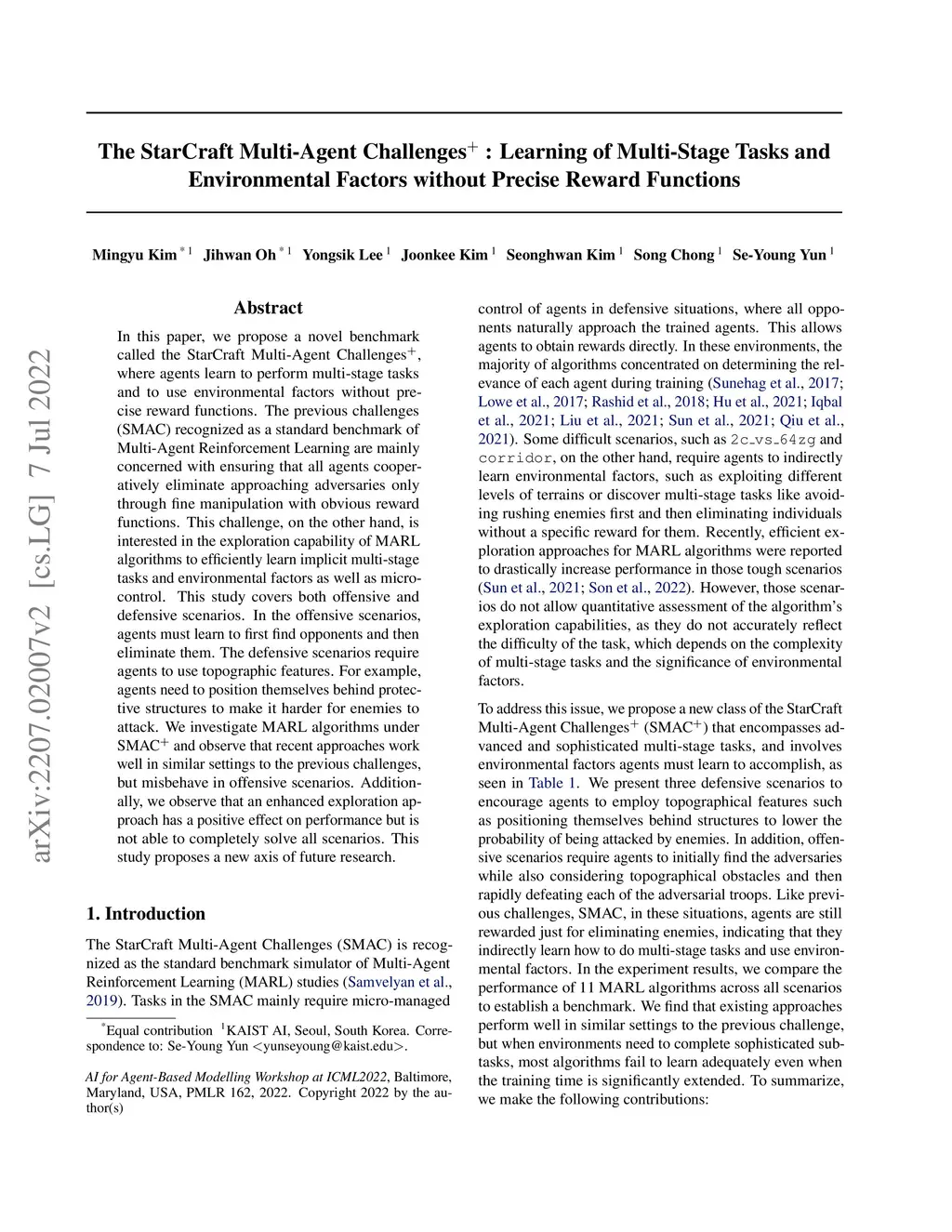 In this paper, we propose a novel benchmark called the StarCraft Multi-Agent Challenges+, where agents learn to perform multi-stage tasks and to use environmental factors without precise reward functions. The previous challenges (SMAC) recognized as a standard benchmark of Multi-Agent Reinforcement Learning are mainly concerned with ensuring that all agents cooperatively eliminate approaching adversaries only through fine manipulation with obvious reward functions. This challenge, on the other hand, is interested in the exploration capability of MARL algorithms to efficiently learn implicit multi-stage tasks and environmental factors as well as micro-control. This study covers both offensive and defensive scenarios. In the offensive scenarios, agents must learn to first find opponents and then eliminate them. The defensive scenarios require agents to use topographic features. For example, agents need to position themselves behind protective structures to make it harder for enemies to attack. We investigate MARL algorithms under SMAC+ and observe that recent approaches work well in similar settings to the previous challenges, but misbehave in offensive scenarios. Additionally, we observe that an enhanced exploration approach has a positive effect on performance but is not able to completely solve all scenarios. This study proposes new directions for future research.