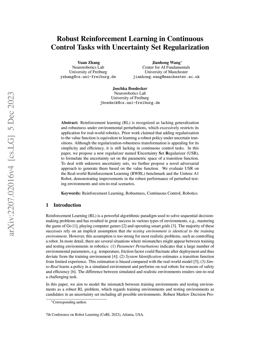 Reinforcement learning (RL) is recognized as lacking generalization and robustness under environmental perturbations, which excessively restricts its application for real-world robotics. Prior work claimed that adding regularization to the value function is equivalent to learning a robust policy with uncertain transitions. Although the regularization-robustness transformation is appealing for its simplicity and efficiency, it is still lacking in continuous control tasks. In this paper, we propose a new regularizer named ncertainty et egularizer (USR), by formulating the uncertainty set on the parameter space of the transition function. In particular, USR is flexible enough to be plugged into any existing RL framework. To deal with unknown uncertainty sets, we further propose a novel adversarial approach to generate them based on the value function. We evaluate USR on the Real-world Reinforcement Learning (RWRL) benchmark, demonstrating improvements in the robust performance for perturbed testing environments.