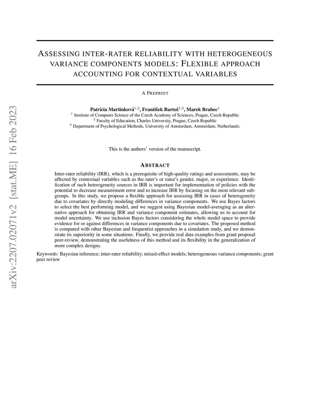 Inter-rater reliability (IRR), which is a prerequisite of high-quality ratings and assessments, may be affected by contextual variables such as the rater's or ratee's gender, major, or experience. Identification of such heterogeneity sources in IRR is important for implementation of policies with the potential to decrease measurement error and to increase IRR by focusing on the most relevant subgroups. In this study, we propose a flexible approach for assessing IRR in cases of heterogeneity due to covariates by directly modeling differences in variance components. We use Bayes factors to select the best performing model, and we suggest using Bayesian model-averaging as an alternative approach for obtaining IRR and variance component estimates, allowing us to account for model uncertainty. We use inclusion Bayes factors considering the whole model space to provide evidence for or against differences in variance components due to covariates. The proposed method is compared with other Bayesian and frequentist approaches in a simulation study, and we demonstrate its superiority in some situations. Finally, we provide real data examples from grant proposal peer-review, demonstrating the usefulness of this method and its flexibility in the generalization of more complex designs.