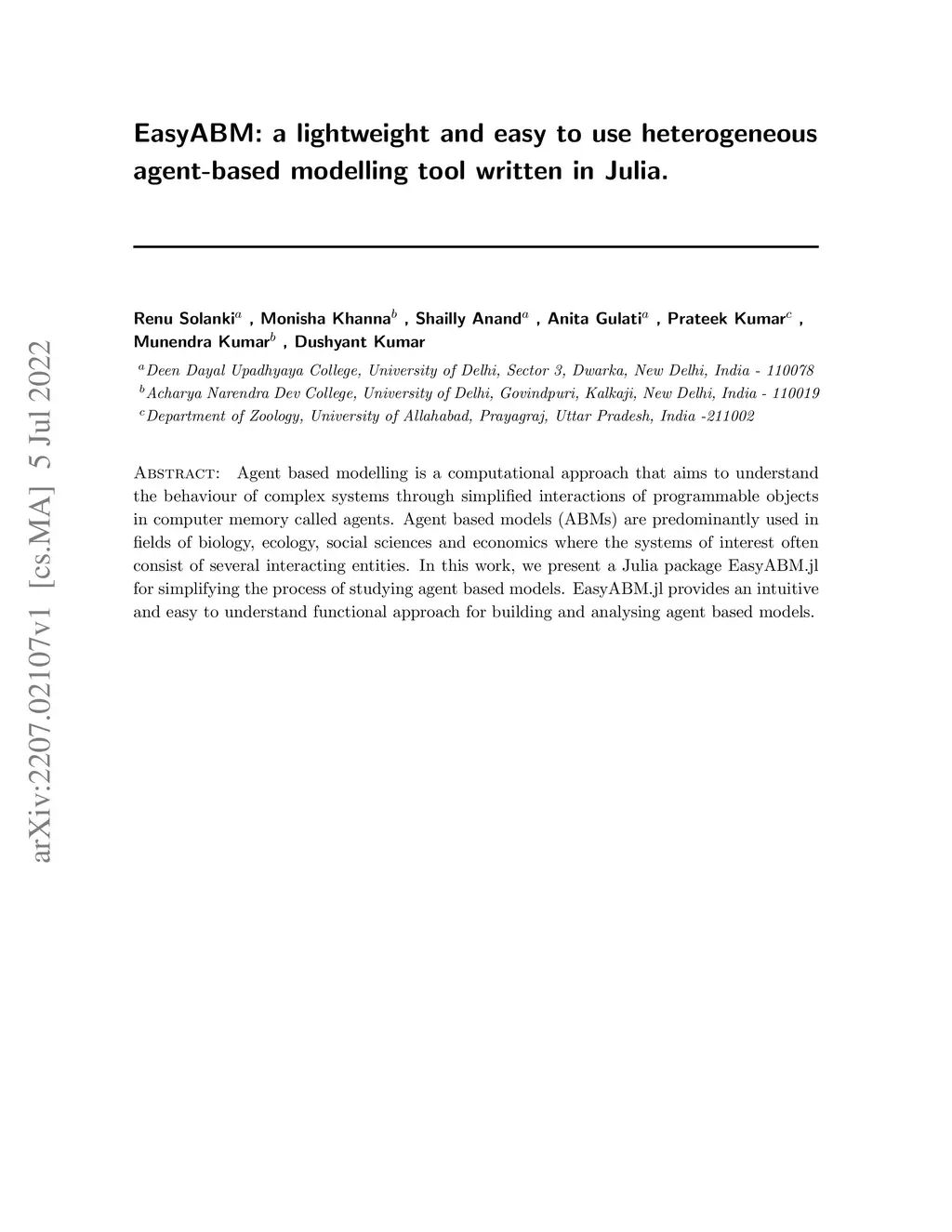 Agent based modelling is a computational approach that aims to understand the behaviour of complex systems through simplified interactions of programmable objects in computer memory called agents. Agent based models (ABMs) are predominantly used in fields of biology, ecology, social sciences and economics where the systems of interest often consist of several interacting entities. In this work, we present a Julia package EasyABM.jl for simplifying the process of studying agent based models. EasyABM.jl provides an intuitive and easy to understand functional approach for building and analysing agent based models.
