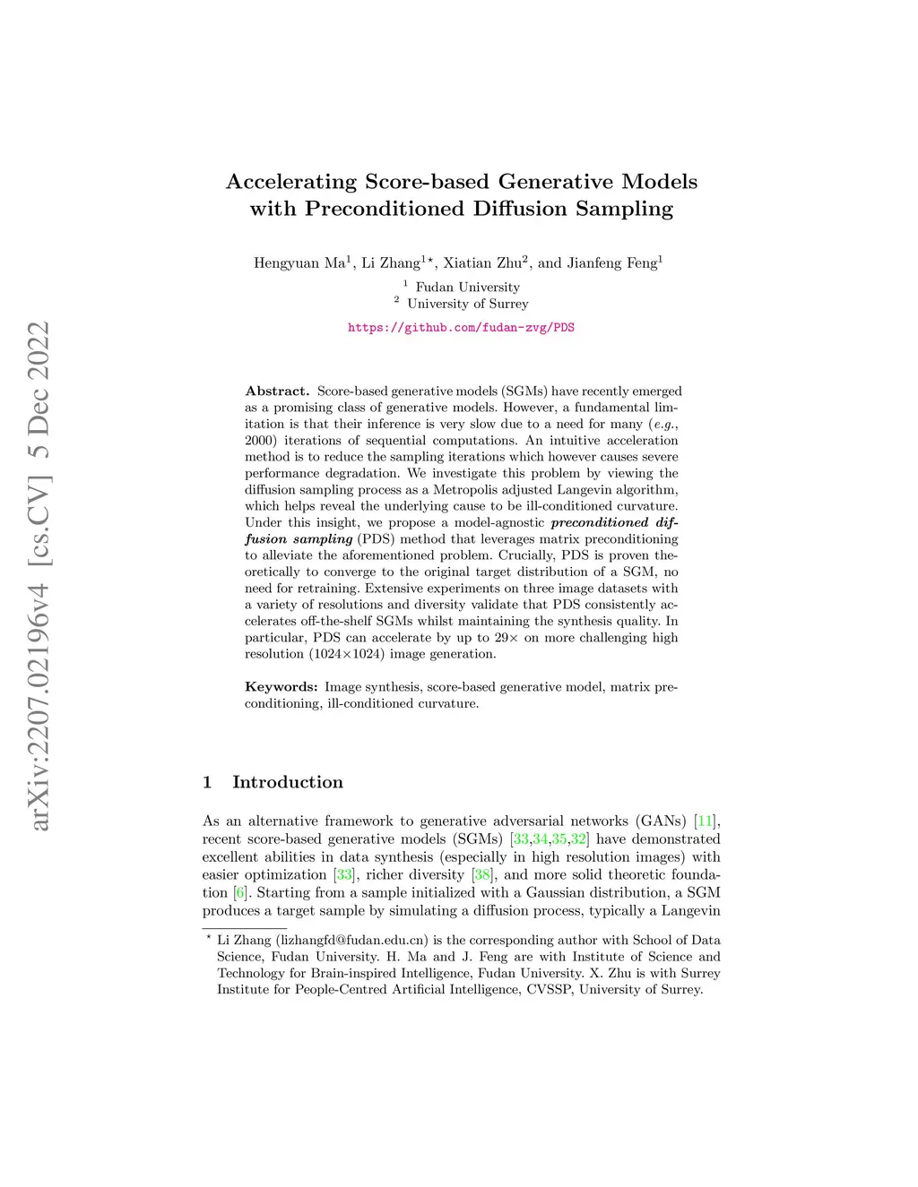 Score-based generative models (SGMs) have recently emerged as a promising class of generative models. However, a fundamental limitation is that their inference is very slow due to a need for many (e.g., 2000) iterations of sequential computations. An intuitive acceleration method is to reduce the sampling iterations which however causes severe performance degradation. We investigate this problem by viewing the diffusion sampling process as a Metropolis adjusted Langevin algorithm, which helps reveal the underlying cause to be ill-conditioned curvature. Under this insight, we propose a model-agnostic preconditioned diffusion sampling (PDS) method that leverages matrix preconditioning to alleviate the aforementioned problem. Crucially, PDS is proven theoretically to converge to the original target distribution of a SGM, no need for retraining. Extensive experiments on three image datasets with a variety of resolutions and diversity validate that PDS consistently accelerates off-the-shelf SGMs whilst maintaining the synthesis quality. In particular, PDS can accelerate by up to 29x on more challenging high resolution (1024x1024) image generation.