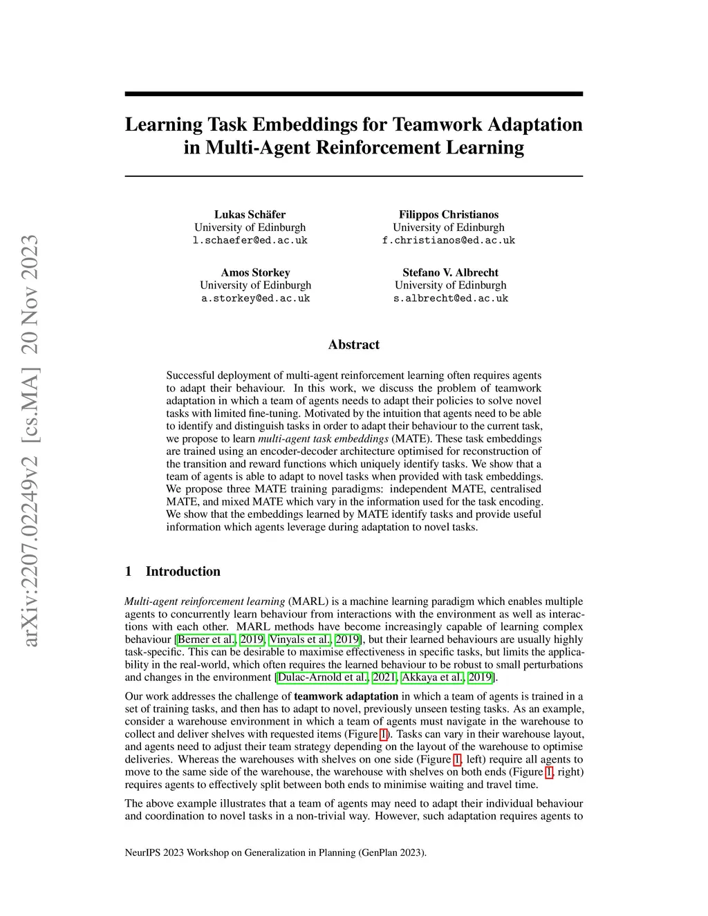 Learning Task Embeddings for Teamwork Adaptation in Multi-Agent
