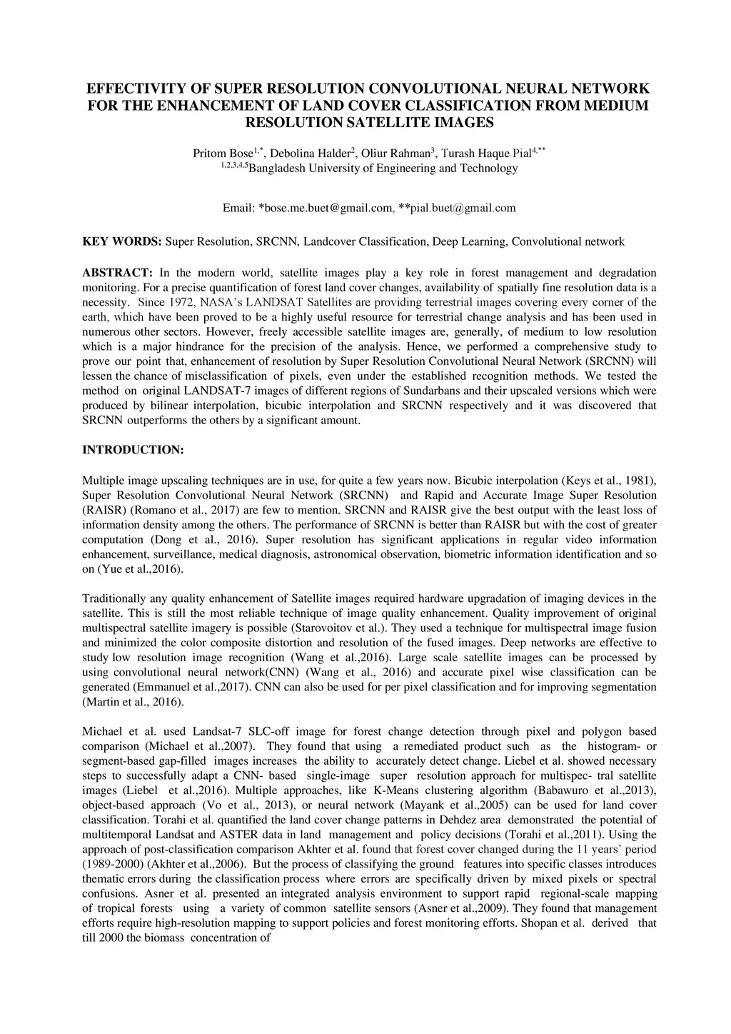 In the modern world, satellite images play a key role in forest management and degradation monitoring. For a precise quantification of forest land cover changes, the availability of spatially fine resolution data is a necessity. Since 1972, NASAs LANDSAT Satellites are providing terrestrial images covering every corner of the earth, which have been proved to be a highly useful resource for terrestrial change analysis and have been used in numerous other sectors. However, freely accessible satellite images are, generally, of medium to low resolution which is a major hindrance to the precision of the analysis. Hence, we performed a comprehensive study to prove our point that, enhancement of resolution by Super-Resolution Convolutional Neural Network (SRCNN) will lessen the chance of misclassification of pixels, even under the established recognition methods. We tested the method on original LANDSAT-7 images of different regions of Sundarbans and their upscaled versions which were produced by bilinear interpolation, bicubic interpolation, and SRCNN respectively and it was discovered that SRCNN outperforms the others by a significant amount.
