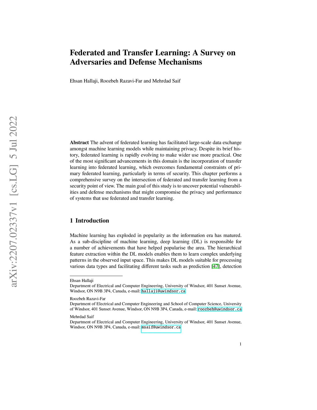 Federated and Transfer Learning: A Survey on Adversaries and Defense