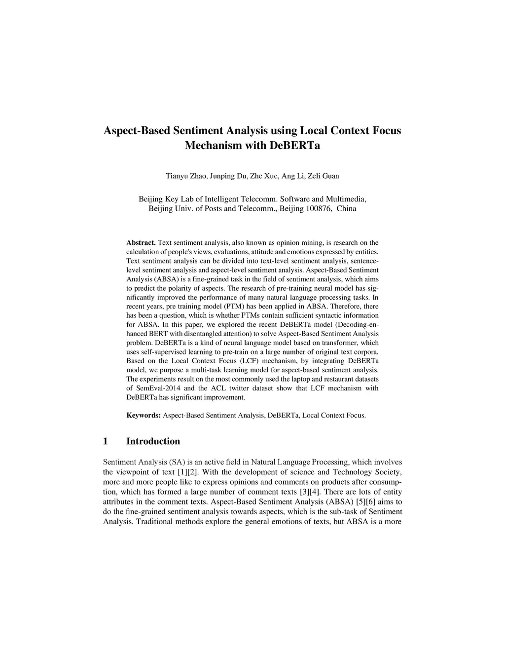 Text sentiment analysis, also known as opinion mining, is research on the calculation of people's views, evaluations, attitude and emotions expressed by entities. Text sentiment analysis can be divided into text-level sentiment analysis, sen-tence-level sentiment analysis and aspect-level sentiment analysis. Aspect-Based Sentiment Analysis (ABSA) is a fine-grained task in the field of sentiment analysis, which aims to predict the polarity of aspects. The research of pre-training neural model has significantly improved the performance of many natural language processing tasks. In recent years, pre training model (PTM) has been applied in ABSA. Therefore, there has been a question, which is whether PTMs contain sufficient syntactic information for ABSA. In this paper, we explored the recent DeBERTa model (Decoding-enhanced BERT with disentangled attention) to solve Aspect-Based Sentiment Analysis problem. DeBERTa is a kind of neural language model based on transformer, which uses self-supervised learning to pre-train on a large number of original text corpora. Based on the Local Context Focus (LCF) mechanism, by integrating DeBERTa model, we purpose a multi-task learning model for aspect-based sentiment analysis. The experiments result on the most commonly used the laptop and restaurant datasets of SemEval-2014 and the ACL twitter dataset show that LCF mechanism with DeBERTa has significant improvement.