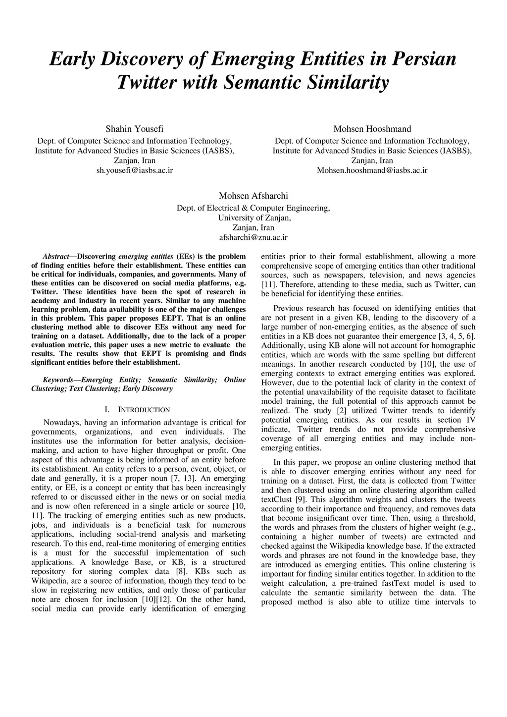 Discovering emerging entities (EEs) is the problem of finding entities before their establishment. These entities can be critical for individuals, companies, and governments. Many of these entities can be discovered on social media platforms, e.g. Twitter. These identities have been the spot of research in academia and industry in recent years. Similar to any machine learning problem, data availability is one of the major challenges in this problem. This paper proposes EEPT. That is an online clustering method able to discover EEs without any need for training on a dataset. Additionally, due to the lack of a proper evaluation metric, this paper uses a new metric to evaluate the results. The results show that EEPT is promising and finds significant entities before their establishment.
