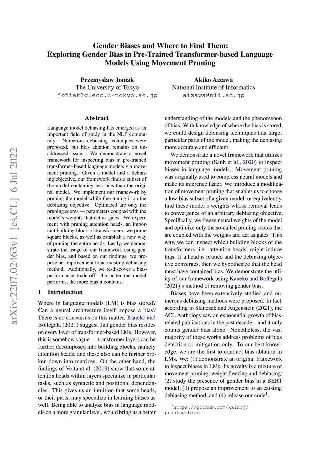 Language model debiasing has emerged as an important field of study in the NLP community. Numerous debiasing techniques were proposed, but bias ablation remains an unaddressed issue. We demonstrate a novel framework for inspecting bias in pre-trained transformer-based language models via movement pruning. Given a model and a debiasing objective, our framework finds a subset of the model containing less bias than the original model. We implement our framework by pruning the model while fine-tuning it on the debiasing objective. Optimized are only the pruning scores - parameters coupled with the model's weights that act as gates. We experiment with pruning attention heads, an important building block of transformers: we prune square blocks, as well as establish a new way of pruning the entire heads. Lastly, we demonstrate the usage of our framework using gender bias, and based on our findings, we propose an improvement to an existing debiasing method. Additionally, we re-discover a bias-performance trade-off: the better the model performs, the more bias it contains.