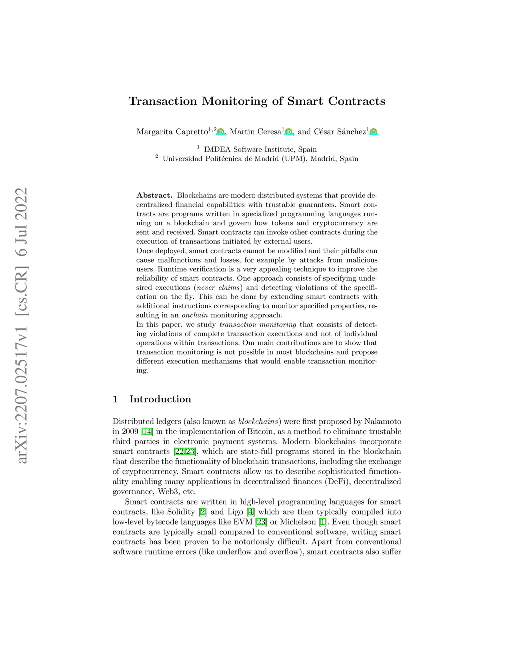 Blockchains are modern distributed systems that provide decentralized financial capabilities with trustable guarantees. Smart contracts are programs written in specialized programming languages running on a blockchain and govern how tokens and cryptocurrency are sent and received. Smart contracts can invoke other contracts during the execution of transactions initiated by external users. Once deployed, smart contracts cannot be modified and their pitfalls can cause malfunctions and losses, for example by attacks from malicious users. Runtime verification is a very appealing technique to improve the reliability of smart contracts. One approach consists of specifying undesired executions (never claims) and detecting violations of the specification on the fly. This can be done by extending smart contracts with additional instructions corresponding to monitor specified properties, resulting in an onchain monitoring approach. In this paper, we study transaction monitoring that consists of detecting violations of complete transaction executions and not of individual operations within transactions. Our main contributions are to show that transaction monitoring is not possible in most blockchains and propose different execution mechanisms that would enable transaction monitoring.