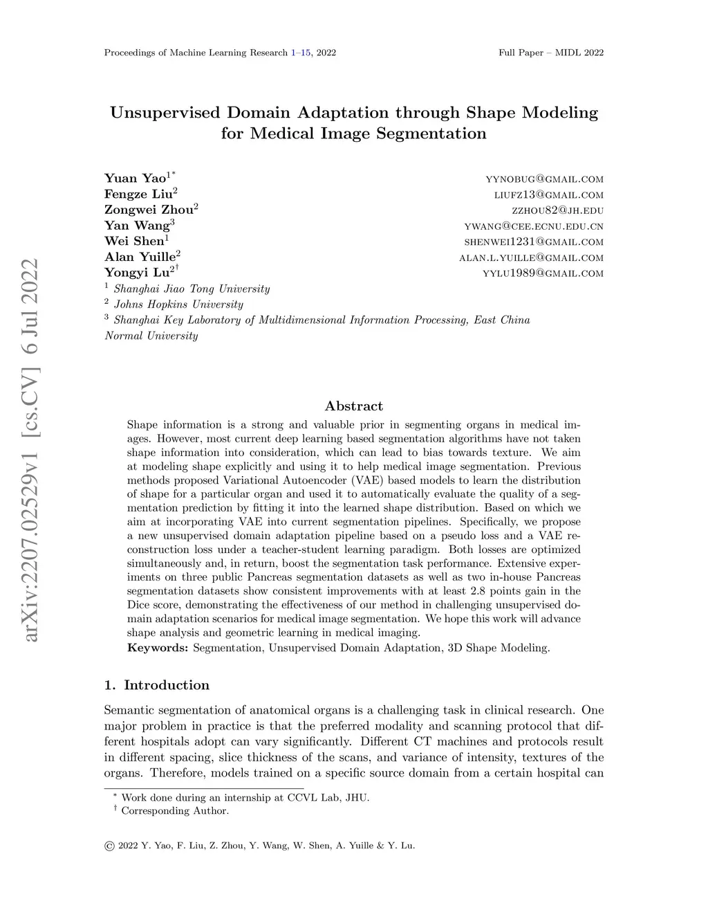 Shape information is a strong and valuable prior in segmenting organs in medical images. However, most current deep learning based segmentation algorithms have not taken shape information into consideration, which can lead to bias towards texture. We aim at modeling shape explicitly and using it to help medical image segmentation. Previous methods proposed Variational Autoencoder (VAE) based models to learn the distribution of shape for a particular organ and used it to automatically evaluate the quality of a segmentation prediction by fitting it into the learned shape distribution. Based on which we aim at incorporating VAE into current segmentation pipelines. Specifically, we propose a new unsupervised domain adaptation pipeline based on a pseudo loss and a VAE reconstruction loss under a teacher-student learning paradigm. Both losses are optimized simultaneously and, in return, boost the segmentation task performance. Extensive experiments on three public Pancreas segmentation datasets as well as two in-house Pancreas segmentation datasets show consistent improvements with at least 2.8 points gain in the Dice score, demonstrating the effectiveness of our method in challenging unsupervised domain adaptation scenarios for medical image segmentation. We hope this work will advance shape analysis and geometric learning in medical imaging.