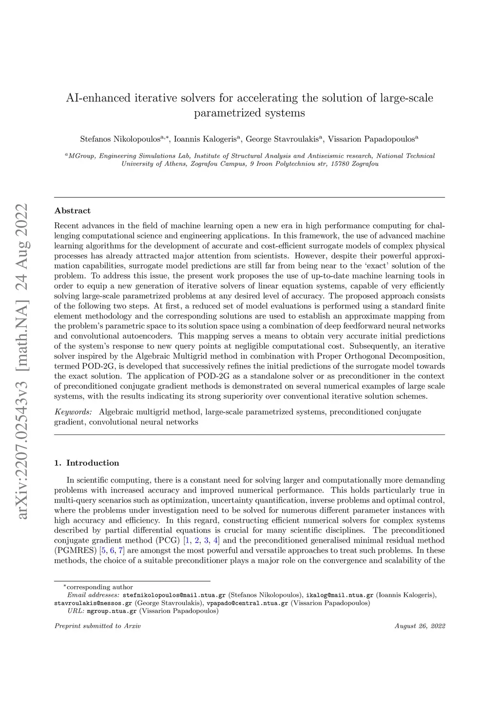 Recent advances in the field of machine learning open a new era in high performance computing. Applications of machine learning algorithms for the development of accurate and cost-efficient surrogates of complex problems have already attracted major attention from scientists. Despite their powerful approximation capabilities, however, surrogates cannot produce the `exact' solution to the problem. To address this issue, this paper exploits up-to-date ML tools and delivers customized iterative solvers of linear equation systems, capable of solving large-scale parametrized problems at any desired level of accuracy. Specifically, the proposed approach consists of the following two steps. At first, a reduced set of model evaluations is performed and the corresponding solutions are used to establish an approximate mapping from the problem's parametric space to its solution space using deep feedforward neural networks and convolutional autoencoders. This mapping serves a means to obtain very accurate initial predictions of the system's response to new query points at negligible computational cost. Subsequently, an iterative solver inspired by the Algebraic Multigrid method in combination with Proper Orthogonal Decomposition, termed POD-2G, is developed that successively refines the initial predictions towards the exact system solutions. The application of POD-2G as a standalone solver or as preconditioner in the context of preconditioned conjugate gradient methods is demonstrated on several numerical examples of large scale systems, with the results indicating its superiority over conventional iterative solution schemes.