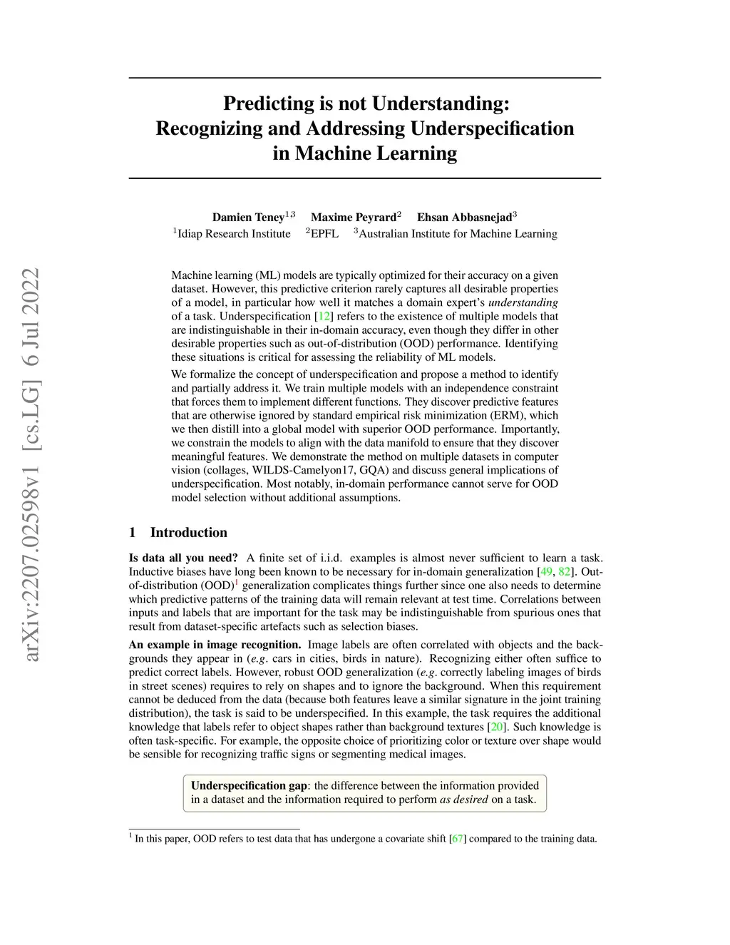 Machine learning (ML) models are typically optimized for their accuracy on a given dataset. However, this predictive criterion rarely captures all desirable properties of a model, in particular how well it matches a domain expert's understanding of a task. Underspecification refers to the existence of multiple models that are indistinguishable in their in-domain accuracy, even though they differ in other desirable properties such as out-of-distribution (OOD) performance. Identifying these situations is critical for assessing the reliability of ML models. We formalize the concept of underspecification and propose a method to identify and partially address it. We train multiple models with an independence constraint that forces them to implement different functions. They discover predictive features that are otherwise ignored by standard empirical risk minimization (ERM), which we then distill into a global model with superior OOD performance. Importantly, we constrain the models to align with the data manifold to ensure that they discover meaningful features. We demonstrate the method on multiple datasets in computer vision (collages, WILDS-Camelyon17, GQA) and discuss general implications of underspecification. Most notably, in-domain performance cannot serve for OOD model selection without additional assumptions.