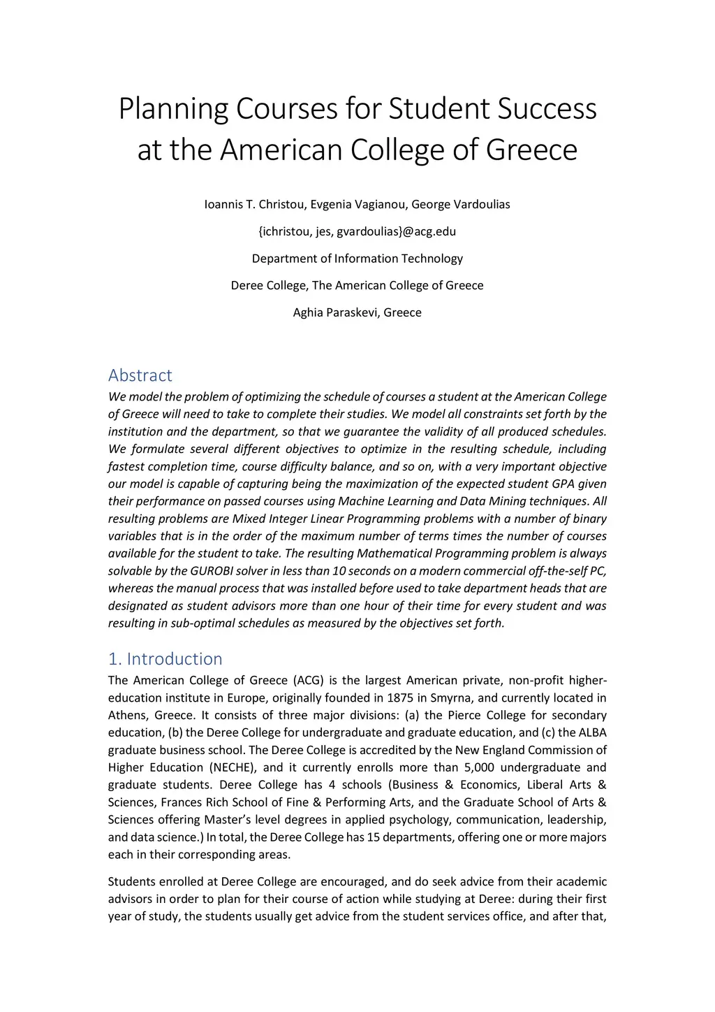 We model the problem of optimizing the schedule of courses a student at the American College of Greece will need to take to complete their studies. We model all constraints set forth by the institution and the department, so that we guarantee the validity of all produced schedules. We formulate several different objectives to optimize in the resulting schedule, including fastest completion time, course difficulty balance, and so on, with a very important objective our model is capable of capturing being the maximization of the expected student GPA given their performance on passed courses using Machine Learning and Data Mining techniques. All resulting problems are Mixed Integer Linear Programming problems with a number of binary variables that is in the order of the maximum number of terms times the number of courses available for the student to take. The resulting Mathematical Programming problem is always solvable by the GUROBI solver in less than 10 seconds on a modern commercial off-the-self PC, whereas the manual process that was installed before used to take department heads that are designated as student advisors more than one hour of their time for every student and was resulting in sub-optimal schedules as measured by the objectives set forth.