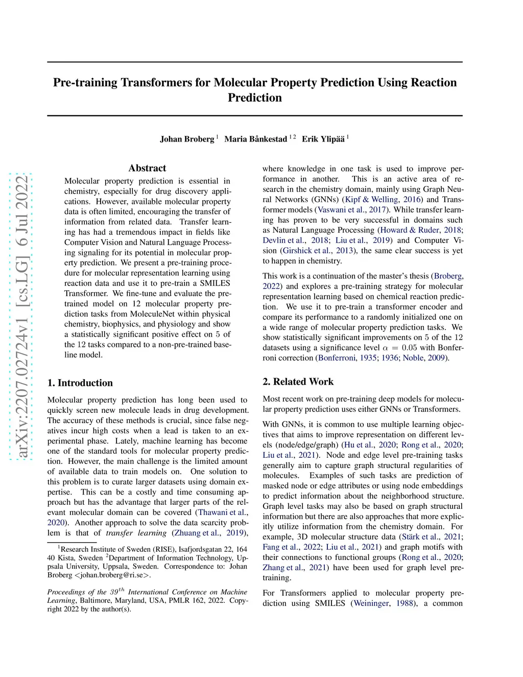 Molecular property prediction is essential in chemistry, especially for drug discovery applications. However, available molecular property data is often limited, encouraging the transfer of information from related data. Transfer learning has had a tremendous impact in fields like Computer Vision and Natural Language Processing signaling for its potential in molecular property prediction. We present a pre-training procedure for molecular representation learning using reaction data and use it to pre-train a SMILES Transformer. We fine-tune and evaluate the pre-trained model on 12 molecular property prediction tasks from MoleculeNet within physical chemistry, biophysics, and physiology and show a statistically significant positive effect on 5 of the 12 tasks compared to a non-pre-trained baseline model.