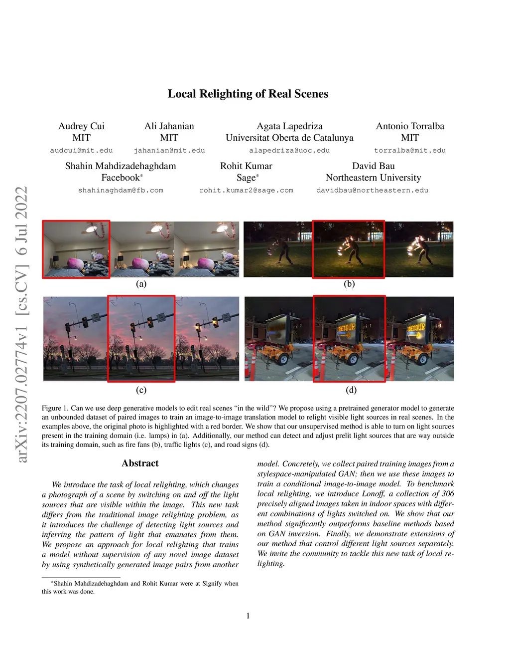We introduce the task of local relighting, which changes a photograph of a scene by switching on and off the light sources that are visible within the image. This new task differs from the traditional image relighting problem, as it introduces the challenge of detecting light sources and inferring the pattern of light that emanates from them. We propose an approach for local relighting that trains a model without supervision of any novel image dataset by using synthetically generated image pairs from another model. Concretely, we collect paired training images from a stylespace-manipulated GAN; then we use these images to train a conditional image-to-image model. To benchmark local relighting, we introduce Lonoff, a collection of 306 precisely aligned images taken in indoor spaces with different combinations of lights switched on. We show that our method significantly outperforms baseline methods based on GAN inversion. Finally, we demonstrate extensions of our method that control different light sources separately. We invite the community to tackle this new task of local relighting.