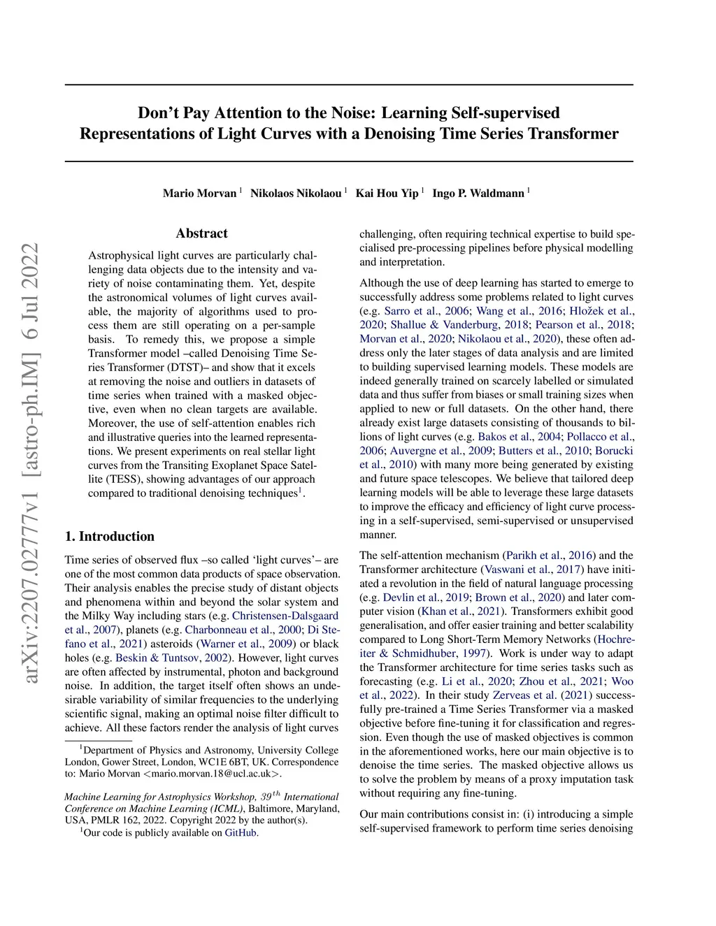Astrophysical light curves are particularly challenging data objects due to the intensity and variety of noise contaminating them. Yet, despite the astronomical volumes of light curves available, the majority of algorithms used to process them are still operating on a per-sample basis. To remedy this, we propose a simple Transformer model -- called Denoising Time Series Transformer (DTST) -- and show that it excels at removing the noise and outliers in datasets of time series when trained with a masked objective, even when no clean targets are available. Moreover, the use of self-attention enables rich and illustrative queries into the learned representations. We present experiments on real stellar light curves from the Transiting Exoplanet Space Satellite (TESS), showing advantages of our approach compared to traditional denoising techniques.