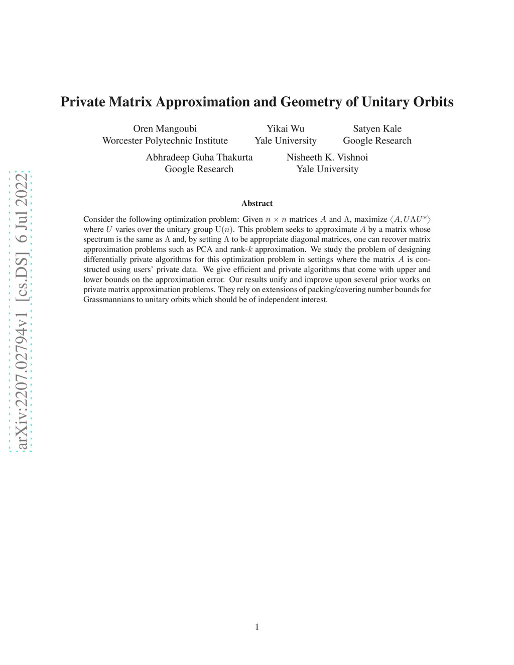 Private Matrix Approximation and Geometry of Unitary Orbits