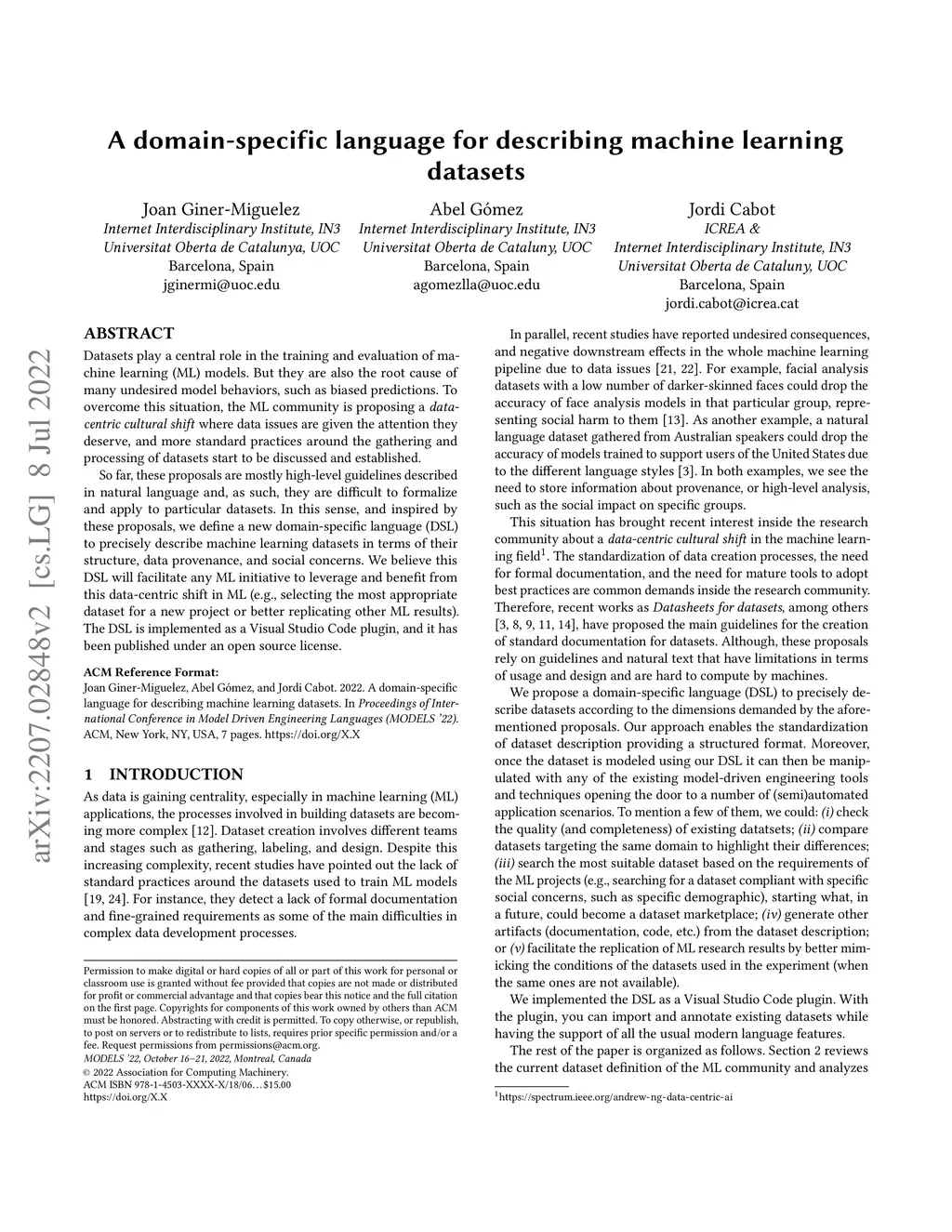 Datasets play a central role in the training and evaluation of machine learning (ML) models. But they are also the root cause of many undesired model behaviors, such as biased predictions. To overcome this situation, the ML community is proposing a data-centric cultural shift where data issues are given the attention they deserve, and more standard practices around the gathering and processing of datasets start to be discussed and established. So far, these proposals are mostly high-level guidelines described in natural language and, as such, they are difficult to formalize and apply to particular datasets. In this sense, and inspired by these proposals, we define a new domain-specific language (DSL) to precisely describe machine learning datasets in terms of their structure, data provenance, and social concerns. We believe this DSL will facilitate any ML initiative to leverage and benefit from this data-centric shift in ML (e.g., selecting the most appropriate dataset for a new project or better replicating other ML results). The DSL is implemented as a Visual Studio Code plugin, and it has been published under an open source license.