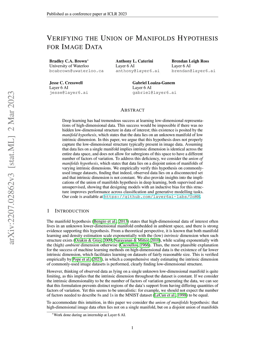 Deep learning has had tremendous success at learning low-dimensional representations of high-dimensional data. This success would be impossible if there was no hidden low-dimensional structure in data of interest; this existence is posited by the manifold hypothesis, which states that the data lies on an unknown manifold of low intrinsic dimension. In this paper, we argue that this hypothesis does not properly capture the low-dimensional structure typically present in image data. Assuming that data lies on a single manifold implies intrinsic dimension is identical across the entire data space, and does not allow for subregions of this space to have a different number of factors of variation. To address this deficiency, we consider the union of manifolds hypothesis, which states that data lies on a disjoint union of manifolds of varying intrinsic dimensions. We empirically verify this hypothesis on commonly-used image datasets, finding that indeed, observed data lies on a disconnected set and that intrinsic dimension is not constant. We also provide insights into the implications of the union of manifolds hypothesis in deep learning, both supervised and unsupervised, showing that designing models with an inductive bias for this structure improves performance across classification and generative modelling tasks. Our code is available at https://github.com/layer6ai-labs/UoMH.