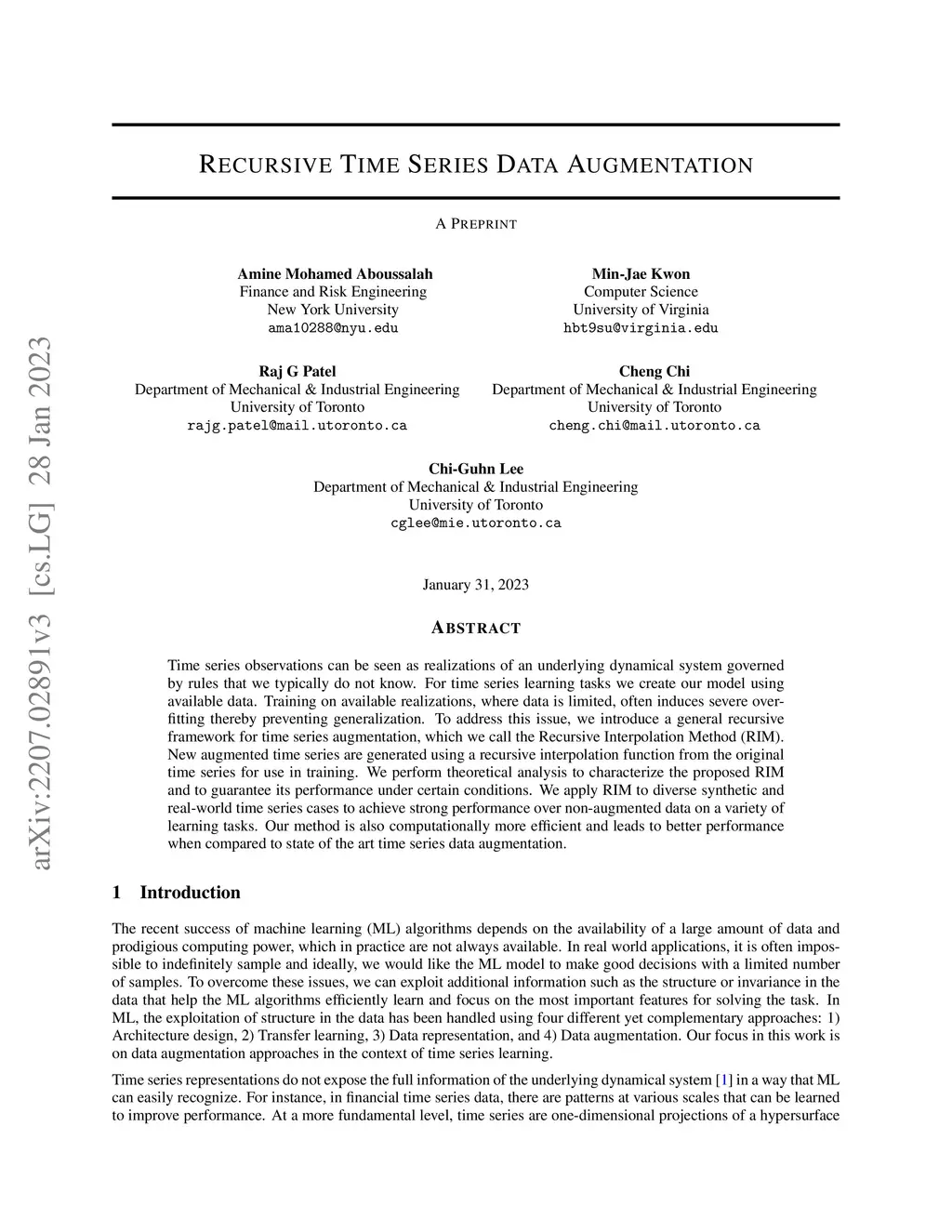 Time series observations can be seen as realizations of an underlying dynamical system governed by rules that we typically do not know. For time series learning tasks, we need to understand that we fit our model on available data, which is a unique realized history. Training on a single realization often induces severe overfitting lacking generalization. To address this issue, we introduce a general recursive framework for time series augmentation, which we call Recursive Interpolation Method, denoted as RIM. New samples are generated using a recursive interpolation function of all previous values in such a way that the enhanced samples preserve the original inherent time series dynamics. We perform theoretical analysis to characterize the proposed RIM and to guarantee its test performance. We apply RIM to diverse real world time series cases to achieve strong performance over non-augmented data on regression, classification, and reinforcement learning tasks.