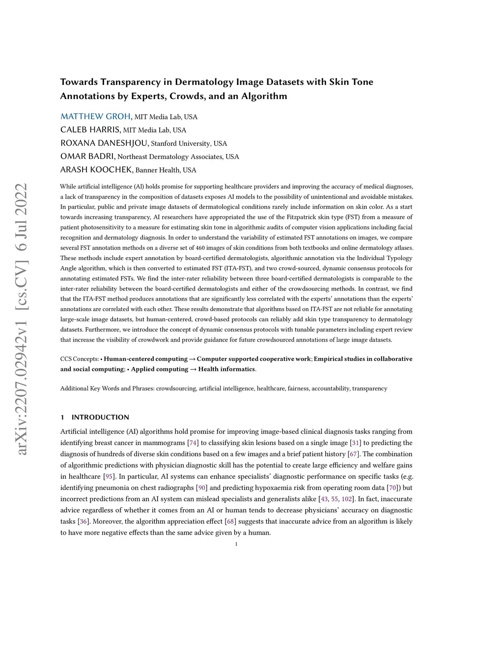 While artificial intelligence (AI) holds promise for supporting healthcare providers and improving the accuracy of medical diagnoses, a lack of transparency in the composition of datasets exposes AI models to the possibility of unintentional and avoidable mistakes. In particular, public and private image datasets of dermatological conditions rarely include information on skin color. As a start towards increasing transparency, AI researchers have appropriated the use of the Fitzpatrick skin type (FST) from a measure of patient photosensitivity to a measure for estimating skin tone in algorithmic audits of computer vision applications including facial recognition and dermatology diagnosis. In order to understand the variability of estimated FST annotations on images, we compare several FST annotation methods on a diverse set of 460 images of skin conditions from both textbooks and online dermatology atlases. We find the inter-rater reliability between three board-certified dermatologists is comparable to the inter-rater reliability between the board-certified dermatologists and two crowdsourcing methods. In contrast, we find that the Individual Typology Angle converted to FST (ITA-FST) method produces annotations that are significantly less correlated with the experts' annotations than the experts' annotations are correlated with each other. These results demonstrate that algorithms based on ITA-FST are not reliable for annotating large-scale image datasets, but human-centered, crowd-based protocols can reliably add skin type transparency to dermatology datasets. Furthermore, we introduce the concept of dynamic consensus protocols with tunable parameters including expert review that increase the visibility of crowdwork and provide guidance for future crowdsourced annotations of large image datasets.