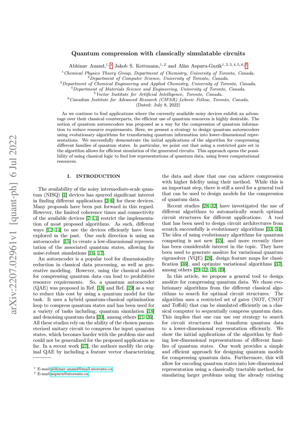 As we continue to find applications where the currently available noisy devices exhibit an advantage over their classical counterparts, the efficient use of quantum resources is highly desirable. The notion of quantum autoencoders was proposed as a way for the compression of quantum information to reduce resource requirements. Here, we present a strategy to design quantum autoencoders using evolutionary algorithms for transforming quantum information into lower-dimensional representations. We successfully demonstrate the initial applications of the algorithm for compressing different families of quantum states. In particular, we point out that using a restricted gate set in the algorithm allows for efficient simulation of the generated circuits. This approach opens the possibility of using classical logic to find low representations of quantum data, using fewer computational resources.