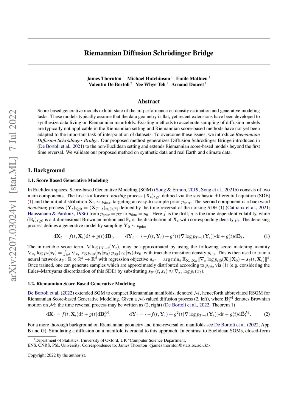 Score-based generative models exhibit state of the art performance on density estimation and generative modeling tasks. These models typically assume that the data geometry is flat, yet recent extensions have been developed to synthesize data living on Riemannian manifolds. Existing methods to accelerate sampling of diffusion models are typically not applicable in the Riemannian setting and Riemannian score-based methods have not yet been adapted to the important task of interpolation of datasets. To overcome these issues, we introduce \emph{Riemannian Diffusion Schr\"odinger Bridge}. Our proposed method generalizes Diffusion Schr\"odinger Bridge introduced in \cite{debortoli2021neurips} to the non-Euclidean setting and extends Riemannian score-based models beyond the first time reversal. We validate our proposed method on synthetic data and real Earth and climate data.