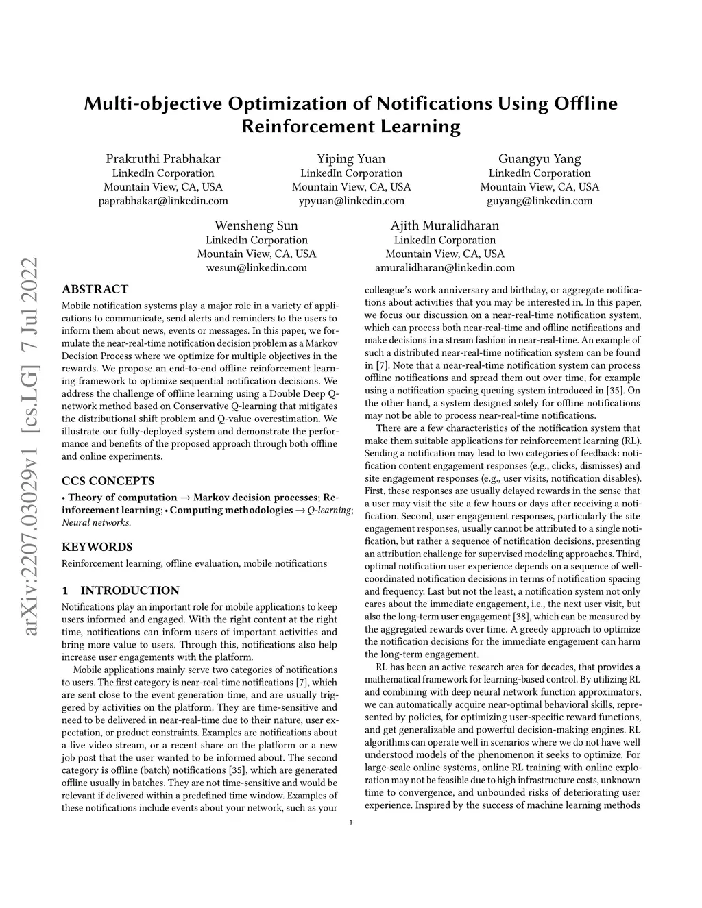 Mobile notification systems play a major role in a variety of applications to communicate, send alerts and reminders to the users to inform them about news, events or messages. In this paper, we formulate the near-real-time notification decision problem as a Markov Decision Process where we optimize for multiple objectives in the rewards. We propose an end-to-end offline reinforcement learning framework to optimize sequential notification decisions. We address the challenge of offline learning using a Double Deep Q-network method based on Conservative Q-learning that mitigates the distributional shift problem and Q-value overestimation. We illustrate our fully-deployed system and demonstrate the performance and benefits of the proposed approach through both offline and online experiments.