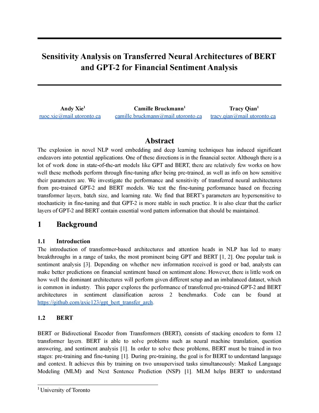 The explosion in novel NLP word embedding and deep learning techniques has induced significant endeavors into potential applications. One of these directions is in the financial sector. Although there is a lot of work done in state-of-the-art models like GPT and BERT, there are relatively few works on how well these methods perform through fine-tuning after being pre-trained, as well as info on how sensitive their parameters are. We investigate the performance and sensitivity of transferred neural architectures from pre-trained GPT-2 and BERT models. We test the fine-tuning performance based on freezing transformer layers, batch size, and learning rate. We find the parameters of BERT are hypersensitive to stochasticity in fine-tuning and that GPT-2 is more stable in such practice. It is also clear that the earlier layers of GPT-2 and BERT contain essential word pattern information that should be maintained.