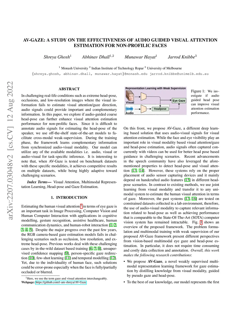 In challenging real-life conditions such as extreme head-pose, occlusions, and low-resolution images where the visual information fails to estimate visual attention/gaze direction, audio signals could provide important and complementary information. In this paper, we explore if audio-guided coarse head-pose can further enhance visual attention estimation performance for non-prolific faces. Since it is difficult to annotate audio signals for estimating the head-pose of the speaker, we use off-the-shelf state-of-the-art models to facilitate cross-modal weak-supervision. During the training phase, the framework learns complementary information from synchronized audio-visual modality. Our model can utilize any of the available modalities i.e. audio, visual or audio-visual for task-specific inference. It is interesting to note that, when AV-Gaze is tested on benchmark datasets with these specific modalities, it achieves competitive results on multiple datasets, while being highly adaptive toward challenging scenarios.