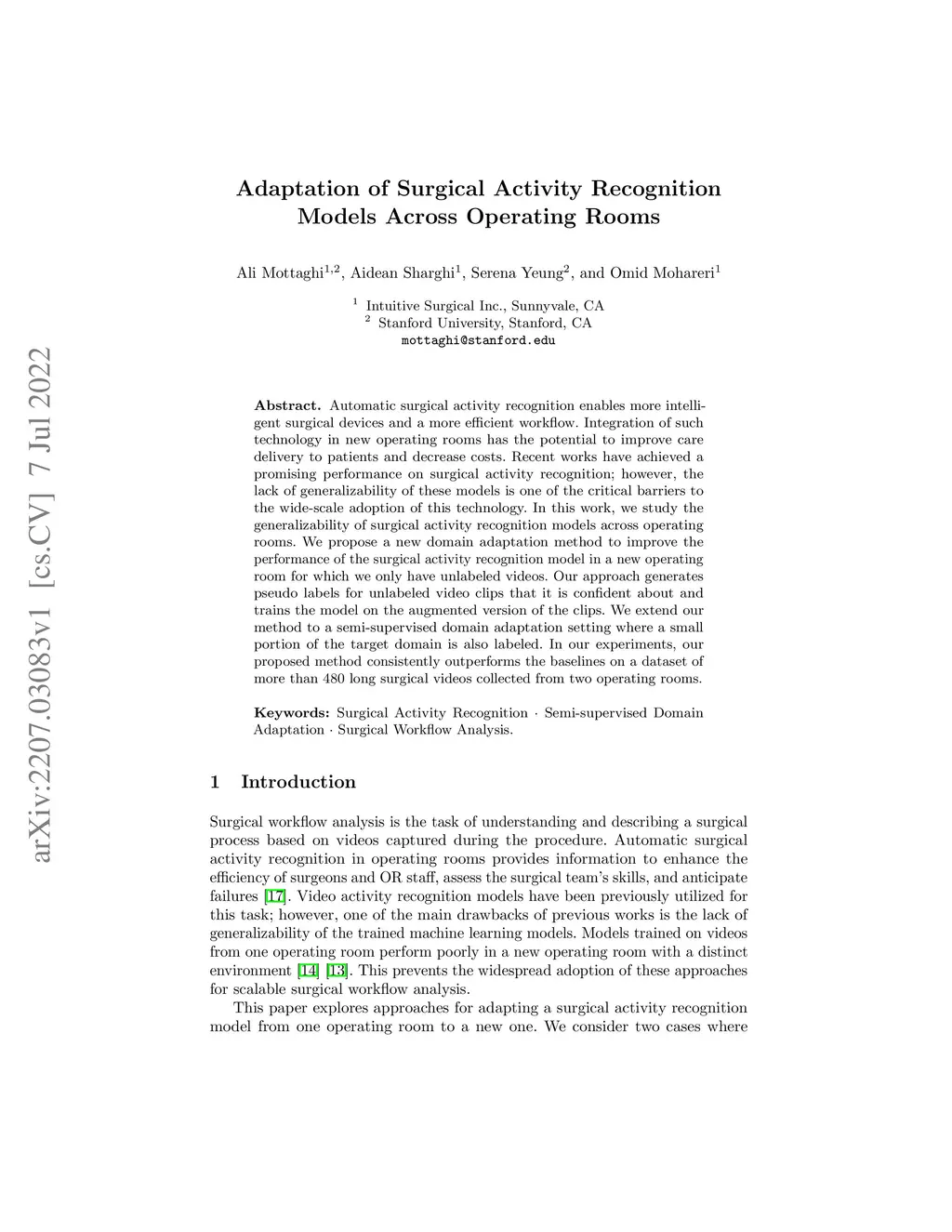 Automatic surgical activity recognition enables more intelligent surgical devices and a more efficient workflow. Integration of such technology in new operating rooms has the potential to improve care delivery to patients and decrease costs. Recent works have achieved a promising performance on surgical activity recognition; however, the lack of generalizability of these models is one of the critical barriers to the wide-scale adoption of this technology. In this work, we study the generalizability of surgical activity recognition models across operating rooms. We propose a new domain adaptation method to improve the performance of the surgical activity recognition model in a new operating room for which we only have unlabeled videos. Our approach generates pseudo labels for unlabeled video clips that it is confident about and trains the model on the augmented version of the clips. We extend our method to a semi-supervised domain adaptation setting where a small portion of the target domain is also labeled. In our experiments, our proposed method consistently outperforms the baselines on a dataset of more than 480 long surgical videos collected from two operating rooms.
