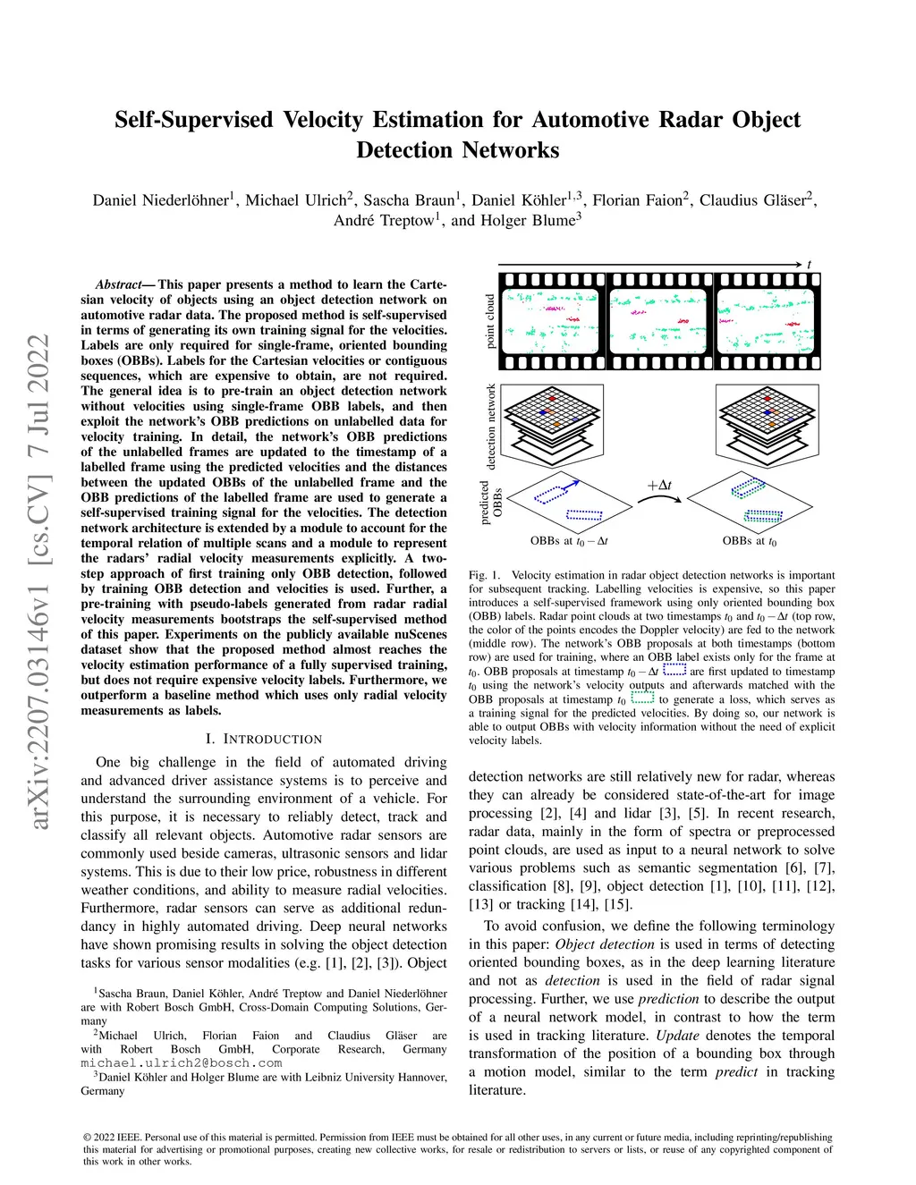 Self-Supervised Velocity Estimation for Automotive Radar Object