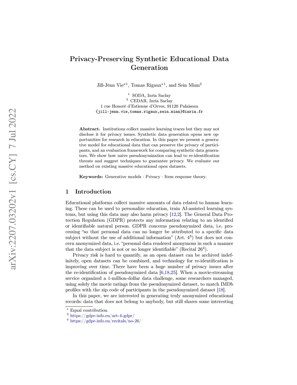 Institutions collect massive learning traces but they may not disclose it for privacy issues. Synthetic data generation opens new opportunities for research in education. In this paper we present a generative model for educational data that can preserve the privacy of participants, and an evaluation framework for comparing synthetic data generators. We show how naive pseudonymization can lead to re-identification threats and suggest techniques to guarantee privacy. We evaluate our method on existing massive educational open datasets.