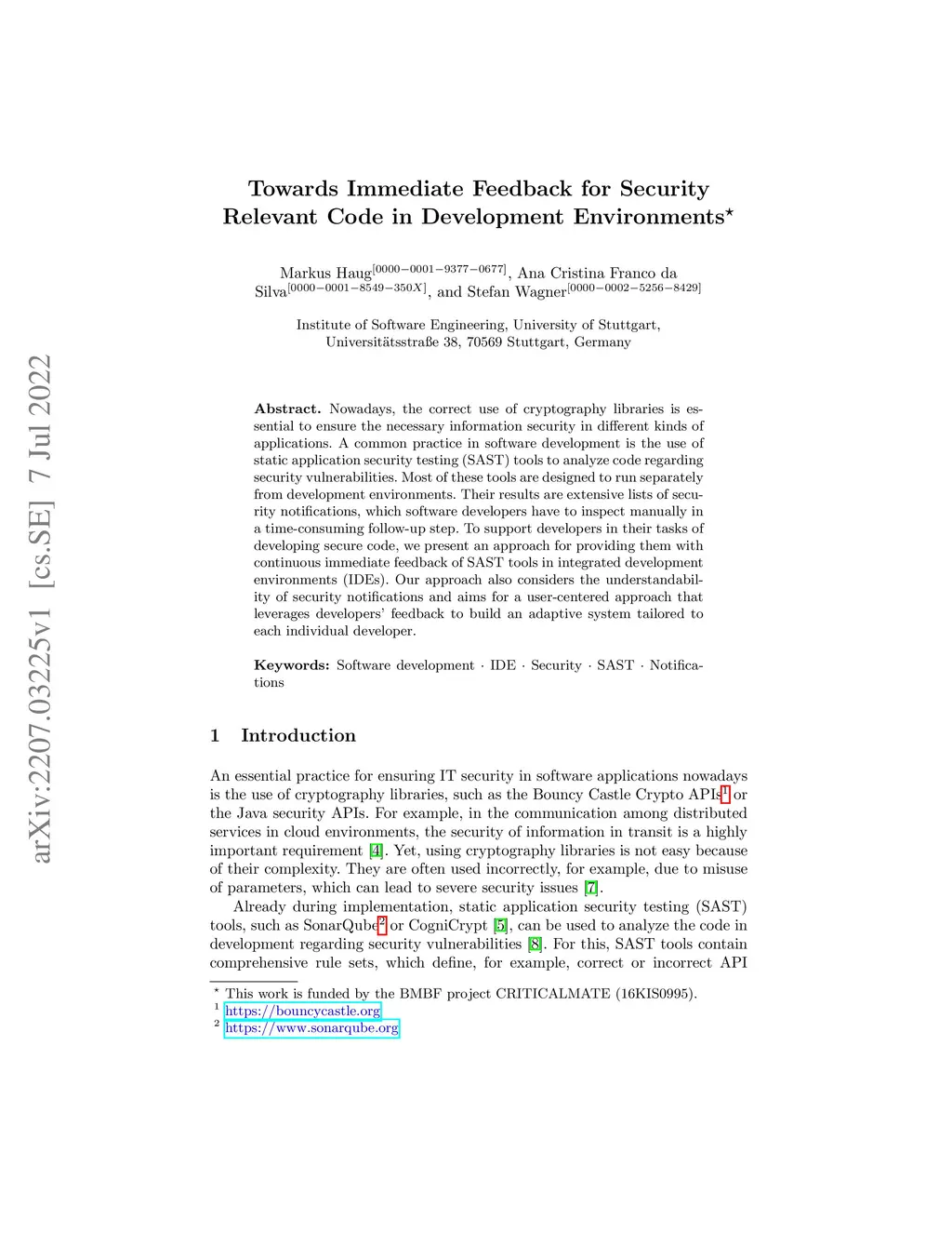 Nowadays, the correct use of cryptography libraries is essential to ensure the necessary information security in different kinds of applications. A common practice in software development is the use of static application security testing (SAST) tools to analyze code regarding security vulnerabilities. Most of these tools are designed to run separately from development environments. Their results are extensive lists of security notifications, which software developers have to inspect manually in a time-consuming follow-up step. To support developers in their tasks of developing secure code, we present an approach for providing them with continuous immediate feedback of SAST tools in integrated development environments (IDEs). Our approach also considers the understandability of security notifications and aims for a user-centered approach that leverages developers' feedback to build an adaptive system tailored to each individual developer.
