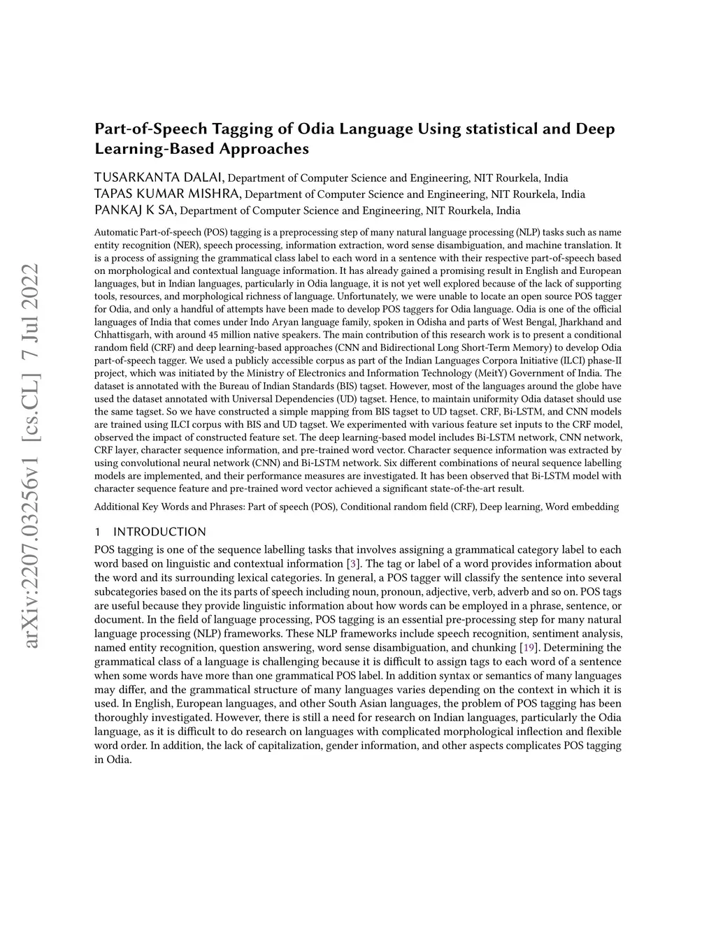 Automatic Part-of-speech (POS) tagging is a preprocessing step of many natural language processing (NLP) tasks such as name entity recognition (NER), speech processing, information extraction, word sense disambiguation, and machine translation. It has already gained a promising result in English and European languages, but in Indian languages, particularly in Odia language, it is not yet well explored because of the lack of supporting tools, resources, and morphological richness of language. Unfortunately, we were unable to locate an open source POS tagger for Odia, and only a handful of attempts have been made to develop POS taggers for Odia language. The main contribution of this research work is to present a conditional random field (CRF) and deep learning-based approaches (CNN and Bidirectional Long Short-Term Memory) to develop Odia part-of-speech tagger. We used a publicly accessible corpus and the dataset is annotated with the Bureau of Indian Standards (BIS) tagset. However, most of the languages around the globe have used the dataset annotated with Universal Dependencies (UD) tagset. Hence, to maintain uniformity Odia dataset should use the same tagset. So we have constructed a simple mapping from BIS tagset to UD tagset. We experimented with various feature set inputs to the CRF model, observed the impact of constructed feature set. The deep learning-based model includes Bi-LSTM network, CNN network, CRF layer, character sequence information, and pre-trained word vector. Character sequence information was extracted by using convolutional neural network (CNN) and Bi-LSTM network. Six different combinations of neural sequence labelling models are implemented, and their performance measures are investigated. It has been observed that Bi-LSTM model with character sequence feature and pre-trained word vector achieved a significant state-of-the-art result.
