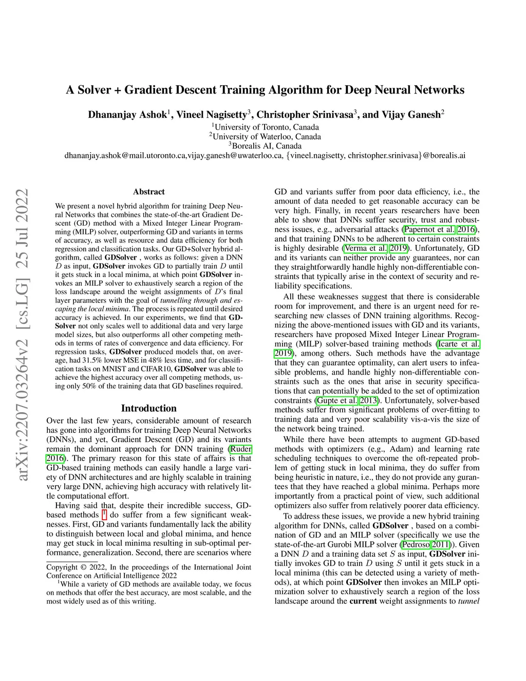 We present a novel hybrid algorithm for training Deep Neural Networks that combines the state-of-the-art Gradient Descent (GD) method with a Mixed Integer Linear Programming (MILP) solver, outperforming GD and variants in terms of accuracy, as well as resource and data efficiency for both regression and classification tasks. Our GD+Solver hybrid algorithm, called GDSolver, works as follows: given a DNN as input, GDSolver invokes GD to partially train until it gets stuck in a local minima, at which point GDSolver invokes an MILP solver to exhaustively search a region of the loss landscape around the weight assignments of 's final layer parameters with the goal of tunnelling through and escaping the local minima. The process is repeated until desired accuracy is achieved. In our experiments, we find that GDSolver not only scales well to additional data and very large model sizes, but also outperforms all other competing methods in terms of rates of convergence and data efficiency. For regression tasks, GDSolver produced models that, on average, had 31.5% lower MSE in 48% less time, and for classification tasks on MNIST and CIFAR10, GDSolver was able to achieve the highest accuracy over all competing methods, using only 50% of the training data that GD baselines required.